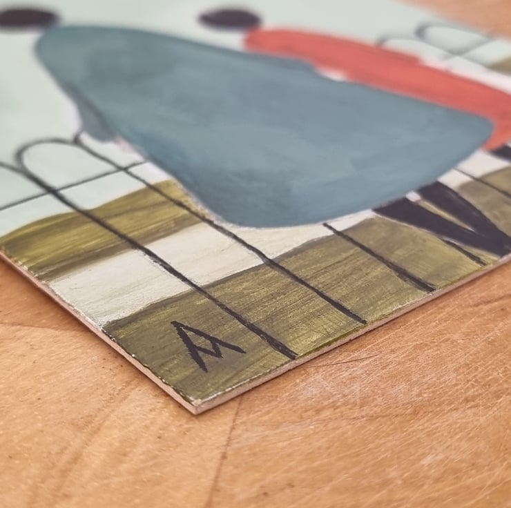 A charming little unframed original painting of a mother and daughter at the park with vintage hues and visible brushstrokes - a sweet gift with a touch of nostalgia or cute piece of art for a childs bedroom.