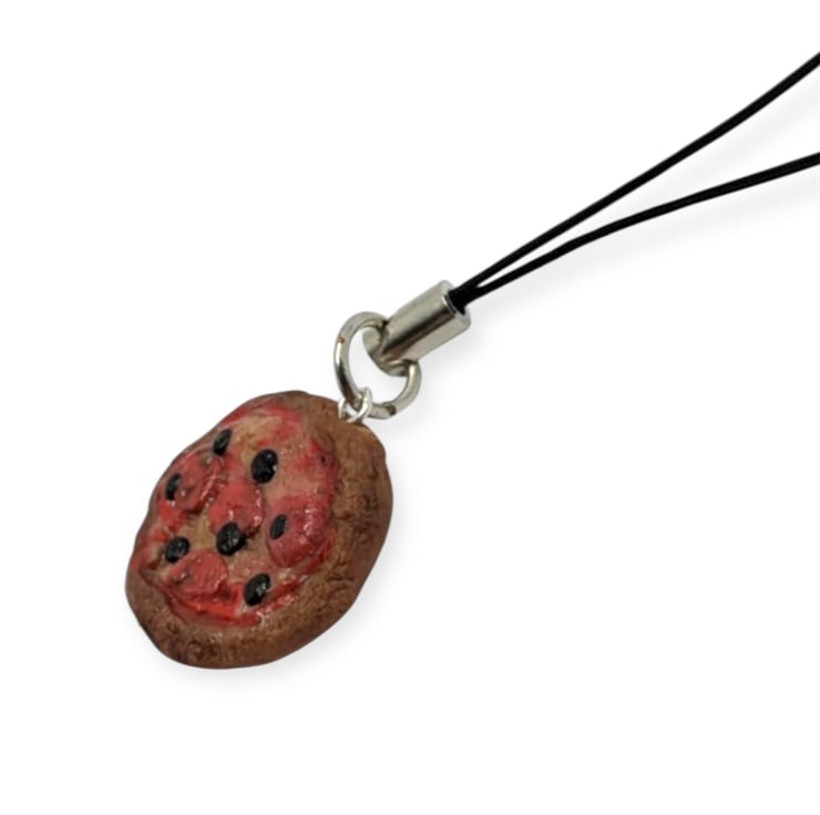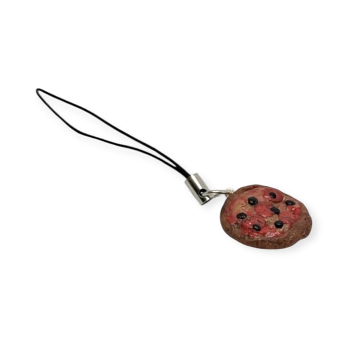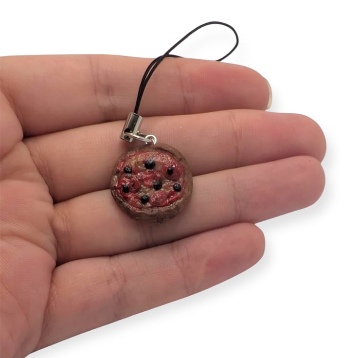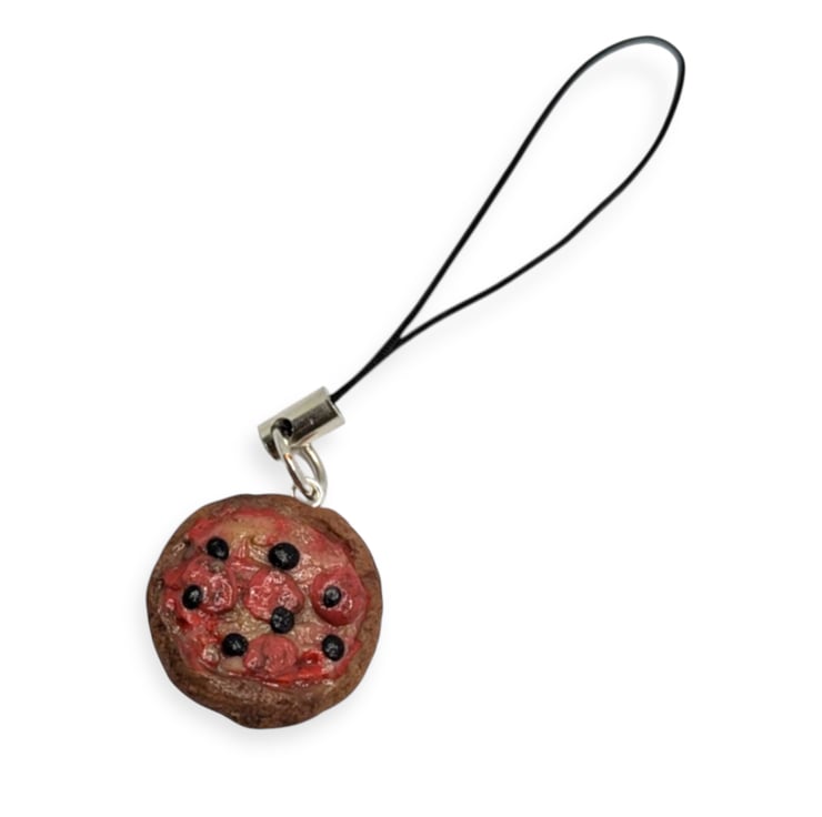 Bring your love of pizza everywhere you go with this miniature whole pizza phone charm, handcrafted from polymer clay with incredible detail. Shaped like a full pizza topped with pepperoni and black olives, it’s a fun and quirky accessory that looks almost good enough to eat!