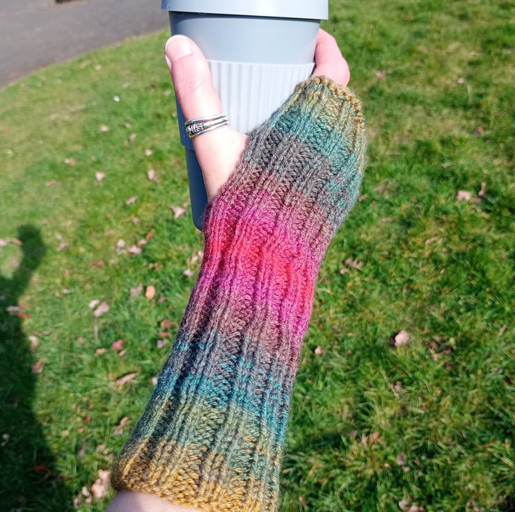 These wrist warmers are a simple accessory, knitted in a stretchy ribbed pattern for maximum comfort across sizes. There's a hole for your thumb, allowing maximum movement for all of your digits.