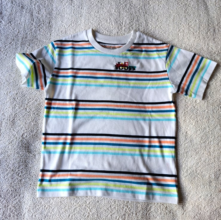 I have hand embroidered a bright red toy engine pulling a deep blue-green truck on the left front of this lovely T-shirt. The shirt is a creamy white, with narrow stripes of bottle green, orange, a kingfisher colour matching the embroidered truck, pale greenish yellow and light turquoise. As I never use a permanent backing material when hand embroidering kids' clothing, there is nothing inside to irritate your child's skin. The shirt has a round neck and short sleeves. It is all cotton and can be machine washed.