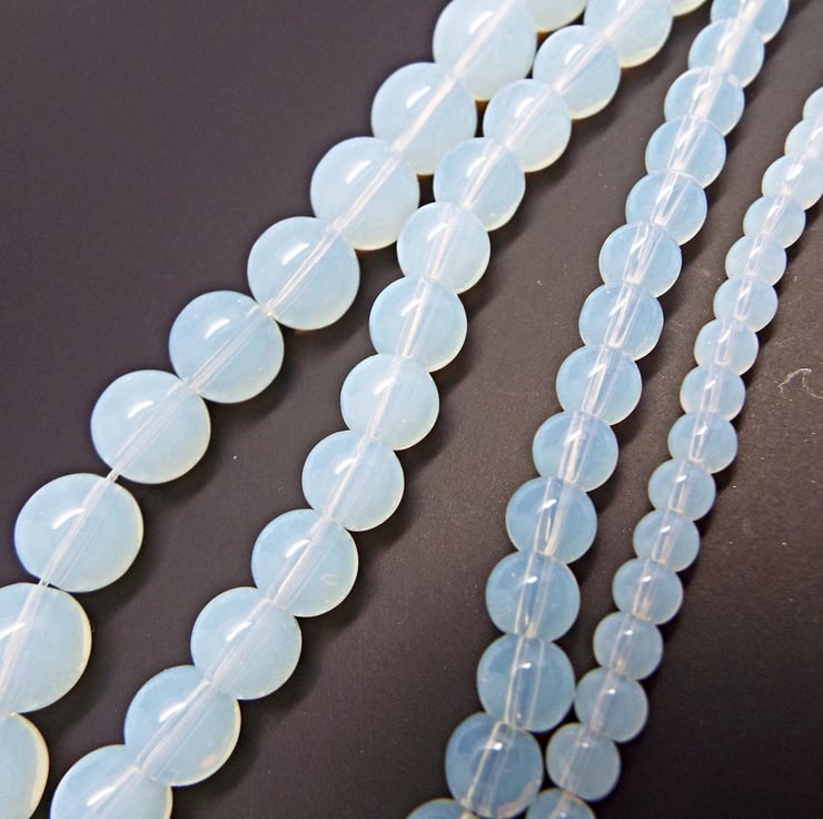 Smooth Synthetic Opal with a milky translucence for beautiful jewellery. Opalite is man-made opalescent glass, made from a mixture of minerals like dolomite, fluorite, and metal oxides. It is created to mimic the appearance of natural opal by replicating Opals opalescent and iridescent qualities. Also available in 4mm, 6mm and 8mm