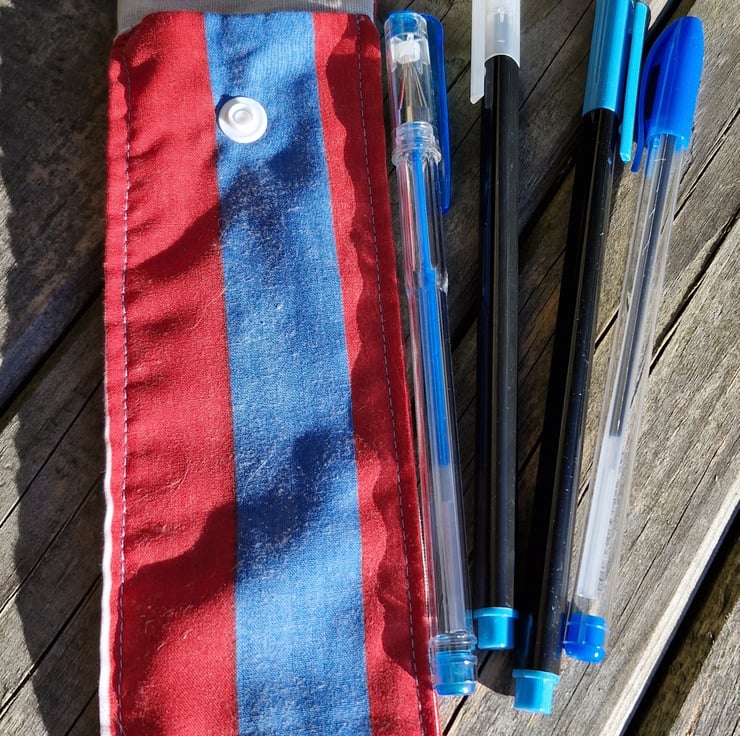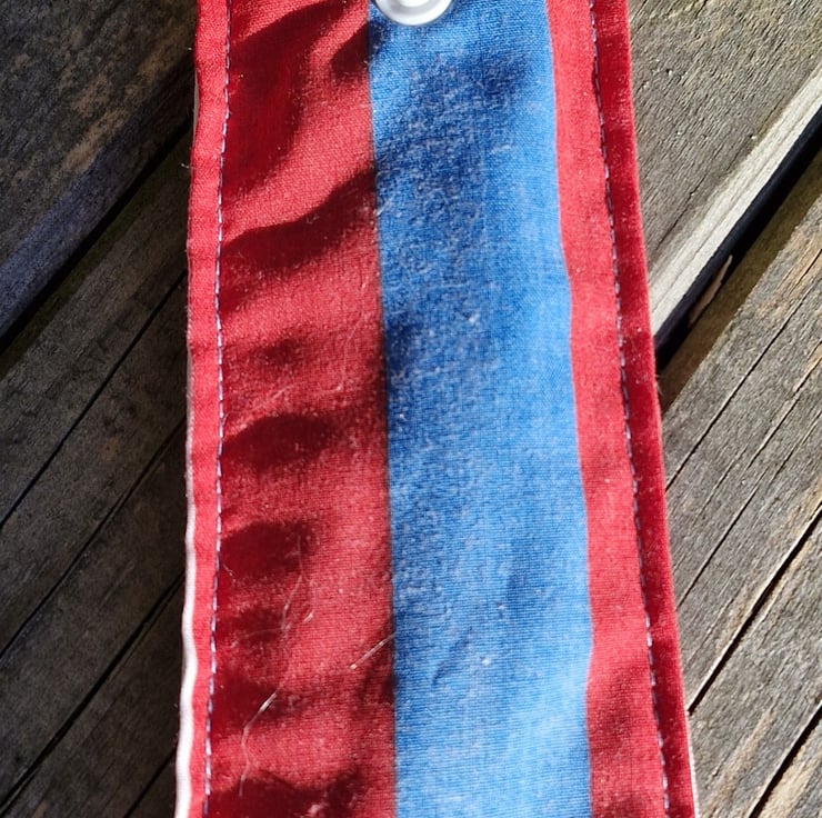It is made from upcycled polycotton material with a red and blue striped design and is fully lined with a lightweight cotton lining.