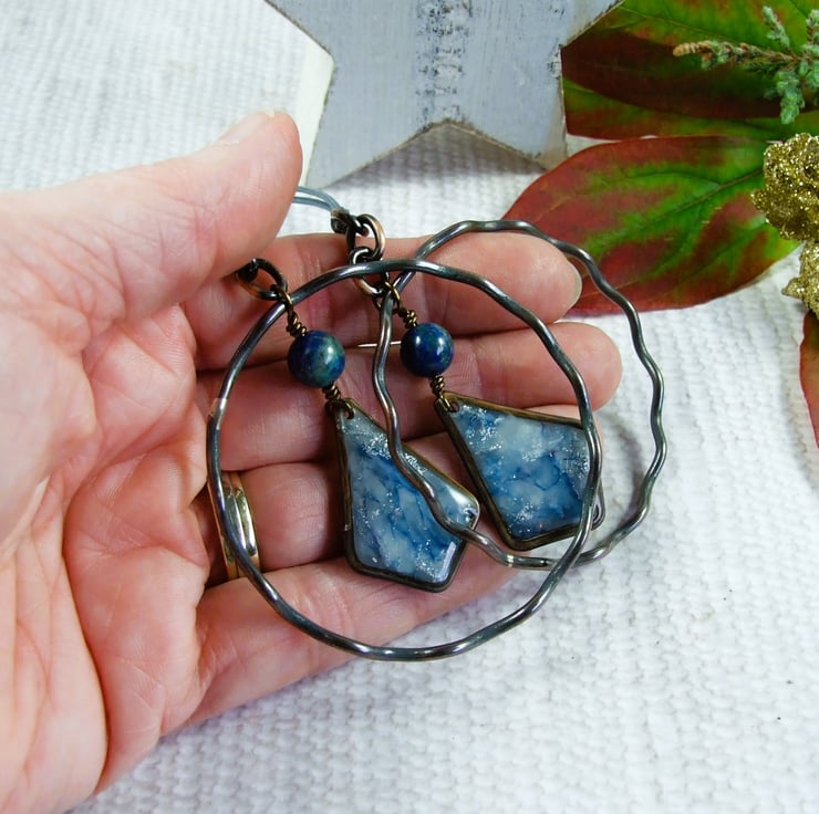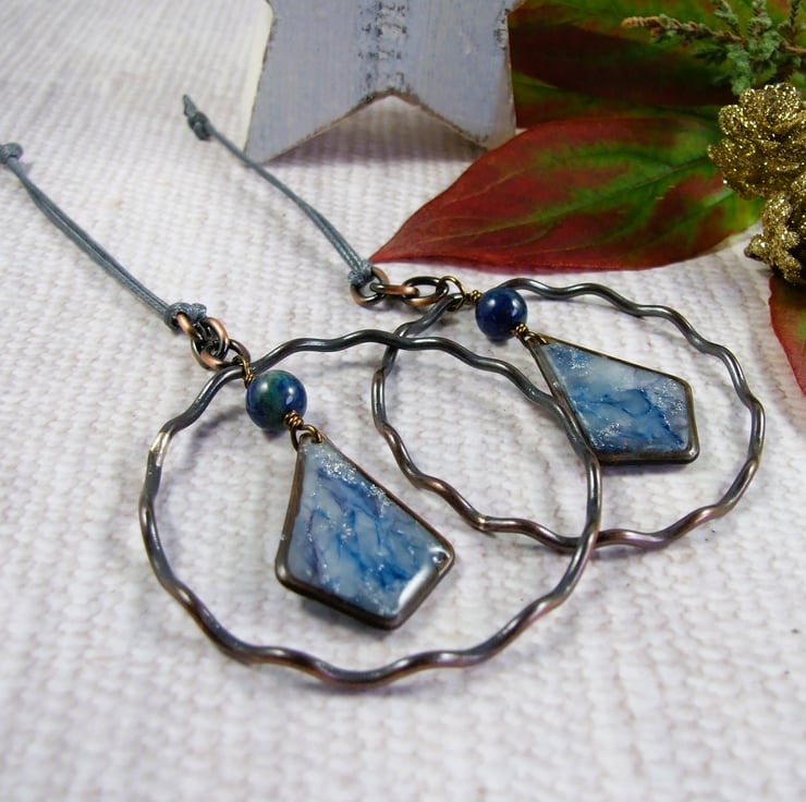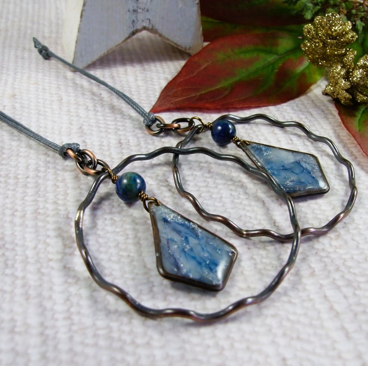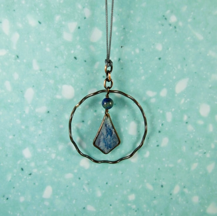I began by creating the marbled clay drops. Taking shades of blue and translucent clay, layered together with metal leaf, blended cut and set inside a copper geometric shape then baked to cure. I have then made the outer copper circle from copper wire and shaped in a steel die to give a wavy effect, securely wire wrapped together with coordinating chrysocolla gemstone beads. Finished with copper chain and waxed cord for hanging.