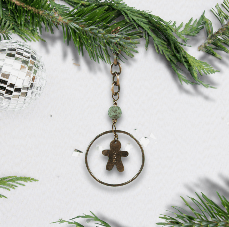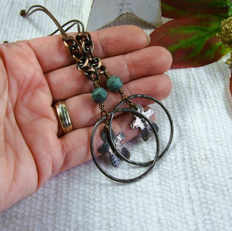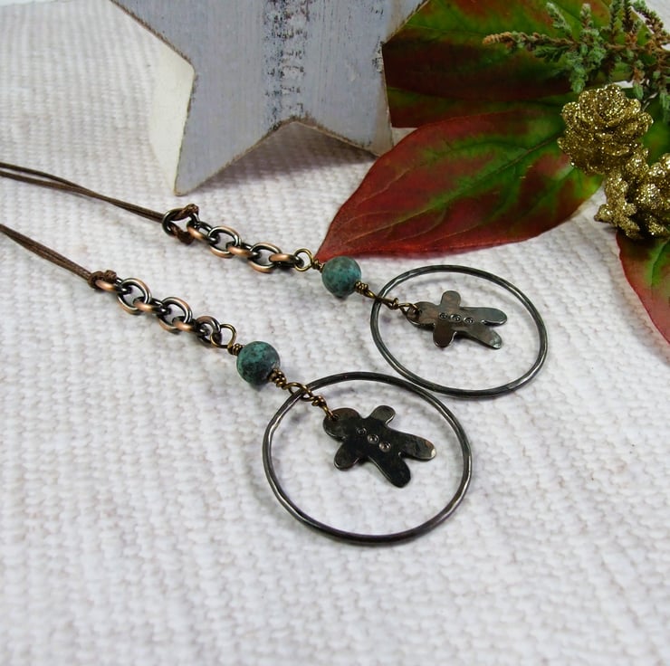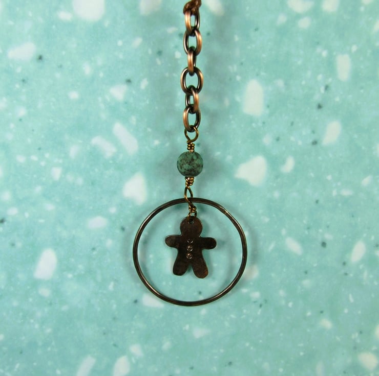 I began by creating the little gingerbread people, cut from copper sheet and hammered for texture. Then I made the outer circles from copper wire, all securely wire wrapped together with contrasting African turquoise gemstone beads. Finished with copper chain and waxed cord for hanging.