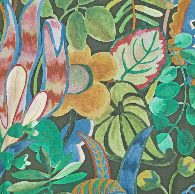 The Jungle Trip print has intense tones and expressive paint marks to create a layered jungle of foliage and flowers. Playfully stylised elements depicted in a range of colours form an imaginative tropical landscape.