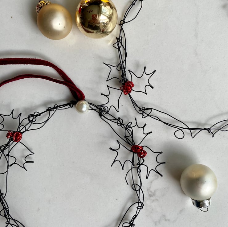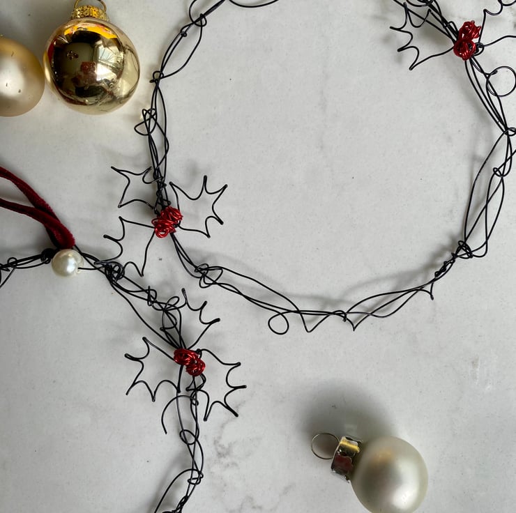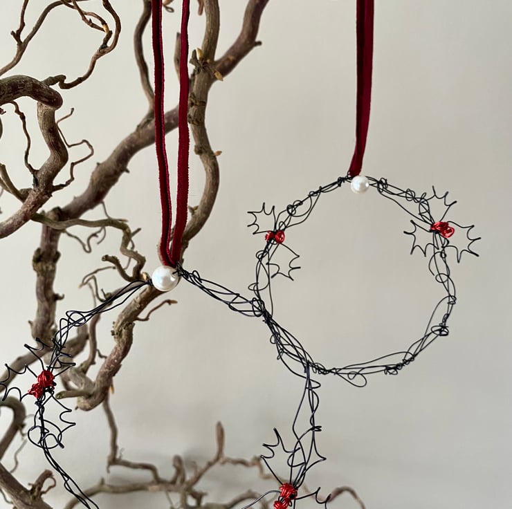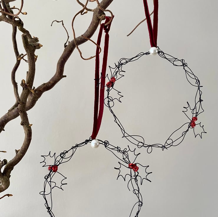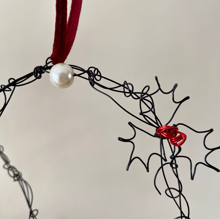 A beautiful handmade wire wreath depicting holly and red berries. Can be hung as a Christmas decoration or used to decorate a door. It looks particularly nice hanging from a door handle.