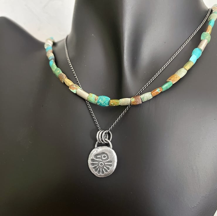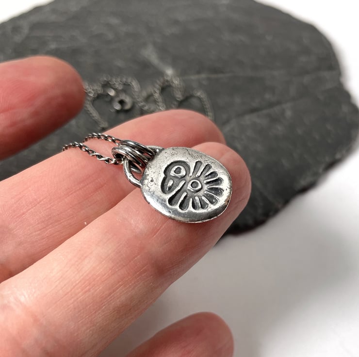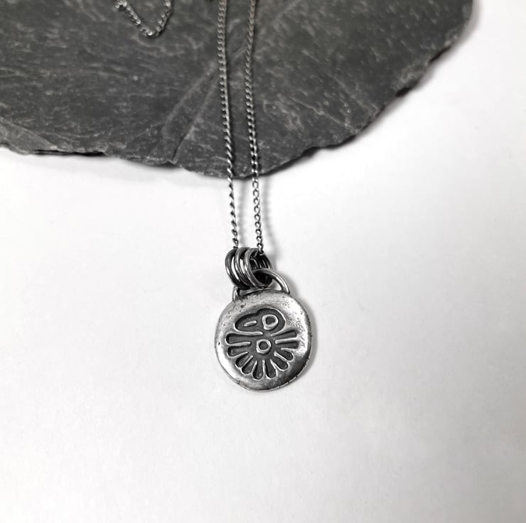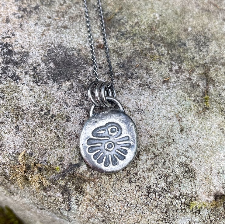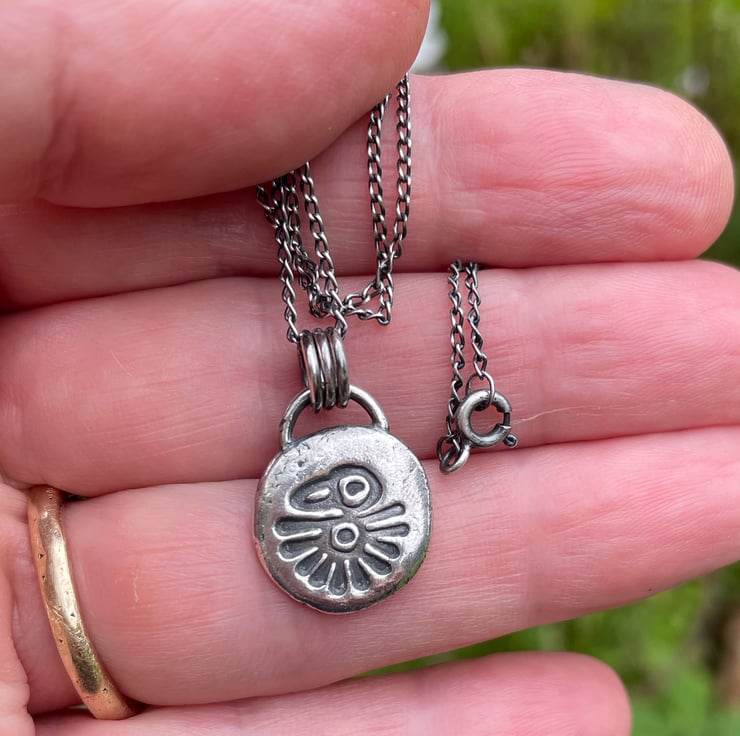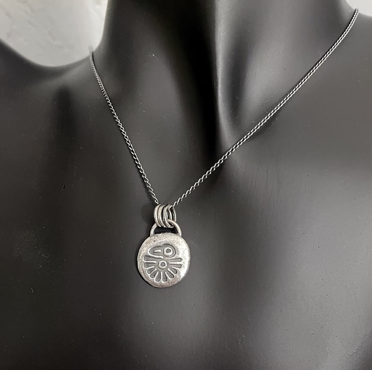 The pendant is a slim, almost round disc shape that has been oxidised in the recesses . I have hung it from an 18” oxidised silver chain.