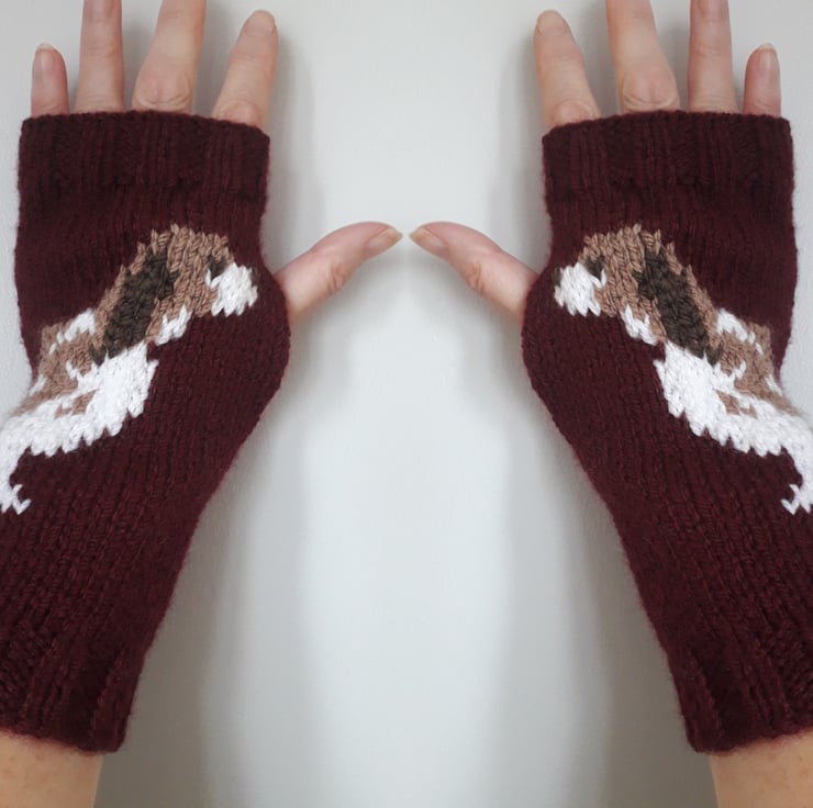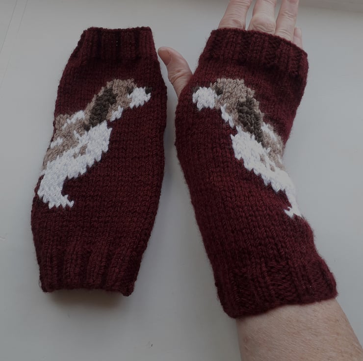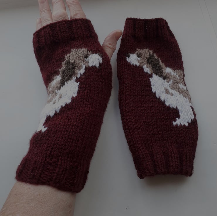 Hand knitted fingerless gloves with spaniel motifs knitted in. Ribbed at wrist and finger ends, crochet edging round thumb holes for strength and neatness.