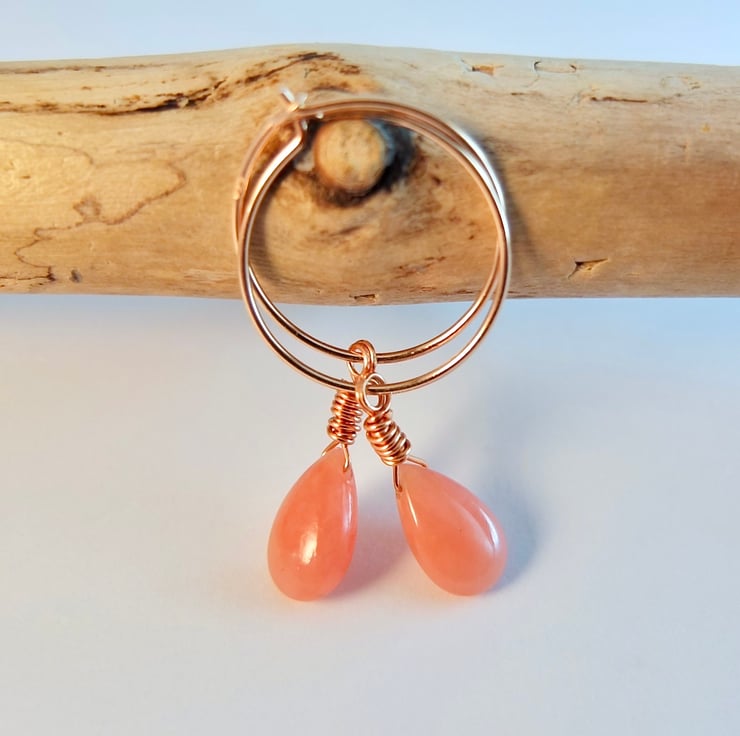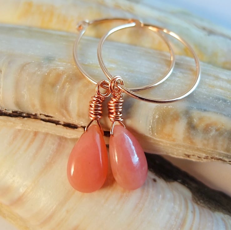 Each dainty little earring features a 7x11mm AA grade Pink Opal teardrop gemstone, wire wrapped and hung on 18mm rose gold vermeil hoop earrings.