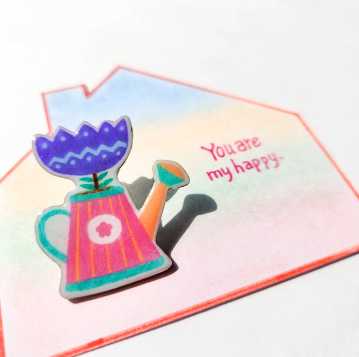 This hand-painted shrink plastic brooch comes beautifully pinned onto a hand-coloured card, with a sweet message. It is individually shaded and coloured by hand, making it unique and a little treasure.