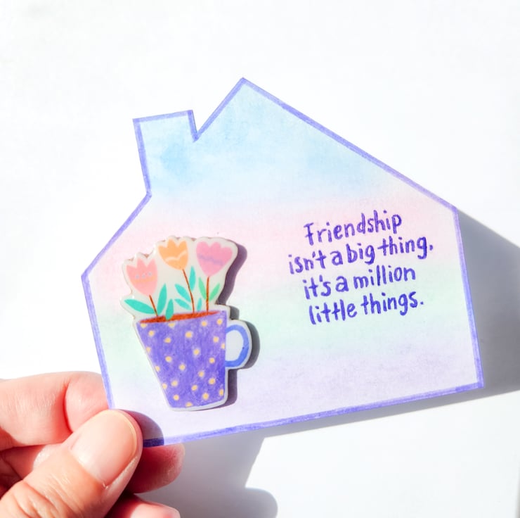 This hand-painted shrink plastic brooch comes beautifully pinned onto a hand-coloured card, with a positive and motivational phrase. It is individually shaded and coloured by hand, making it unique and a little treasure.