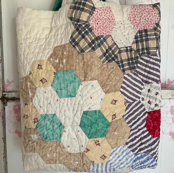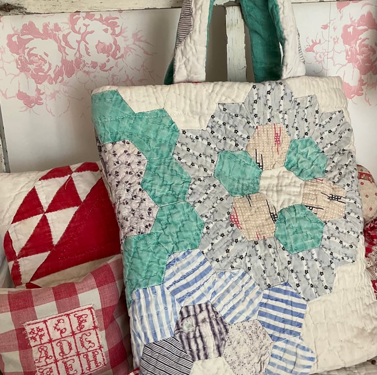 A gorgeous tote bag, to carry your projects to stitch clubs or workshops. This bag and handles are made from a piece of antique hexagon patchwork quilt.