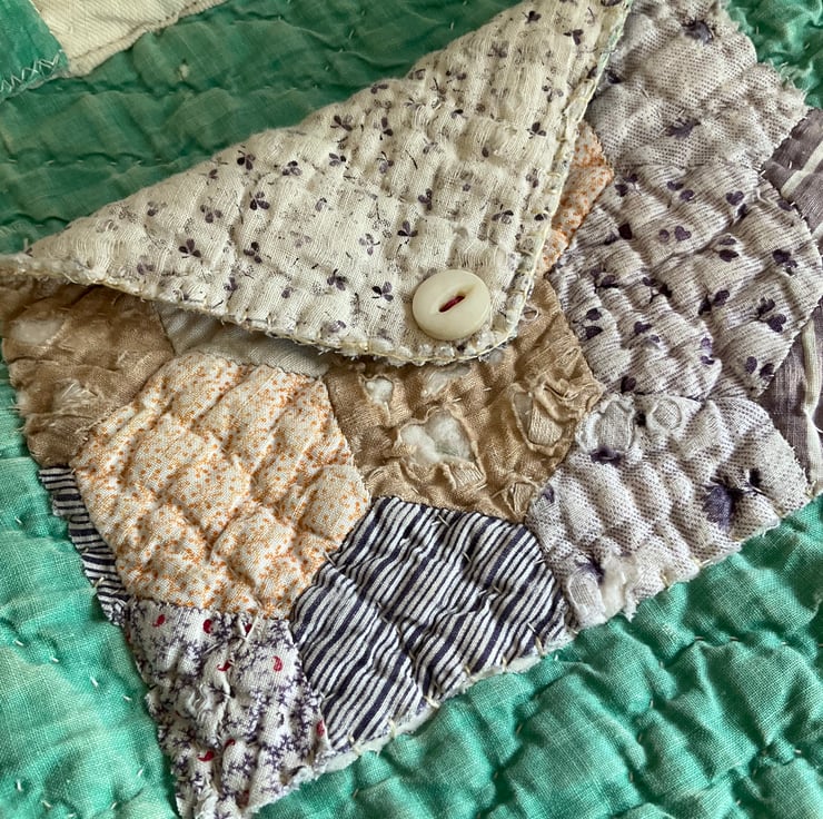 The bag has not been lined so you can view both sides of the quilt. Inside the bag there is an envelope style pocket, with a vintage pearl button on the flap, which is also edged in blanket stitch.