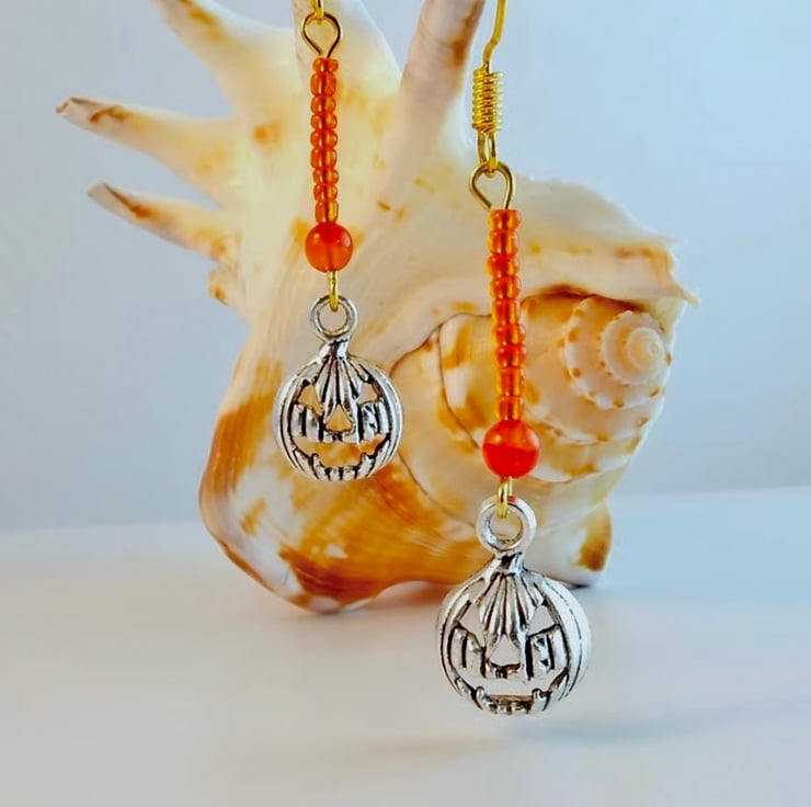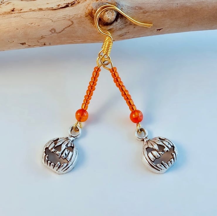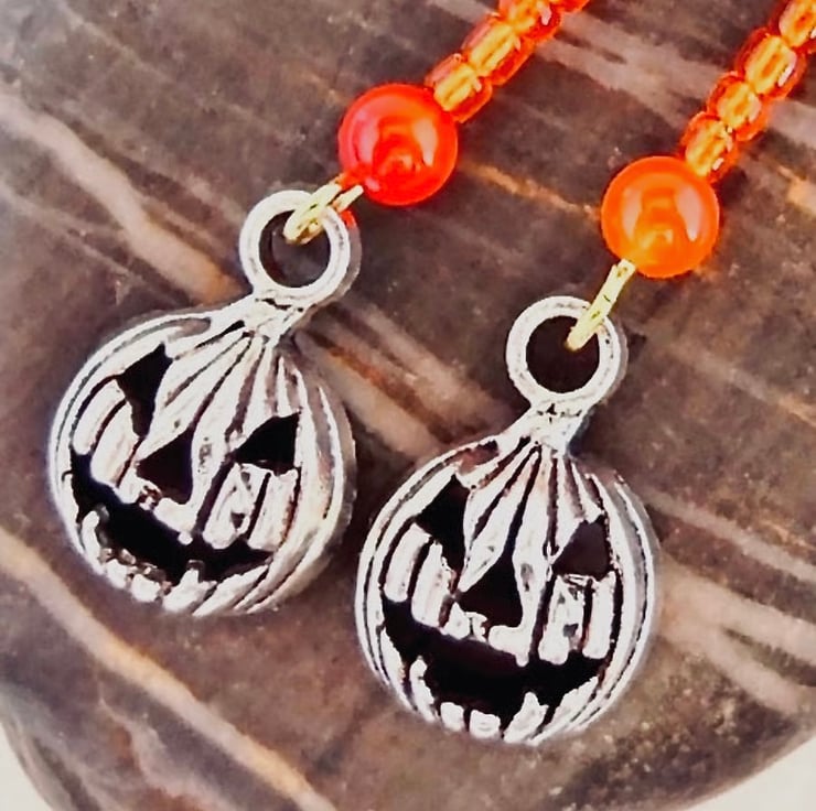 A 4mm orange Agate bead, a row of 9 orange glass seed beads and a Tibetan silver pumpkin charm with a scary face.