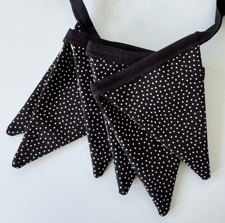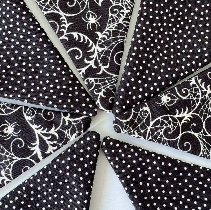 Get set for the spookiest night of the year - decorate with Hallowe'en Bunting comprising seven reversible and reusable fabric flags, featuring feathery gossamer spider webs - and also, spot the spiders! - and alternate flags with tiny black and white polka dots. All sewn onto black cotton tape.