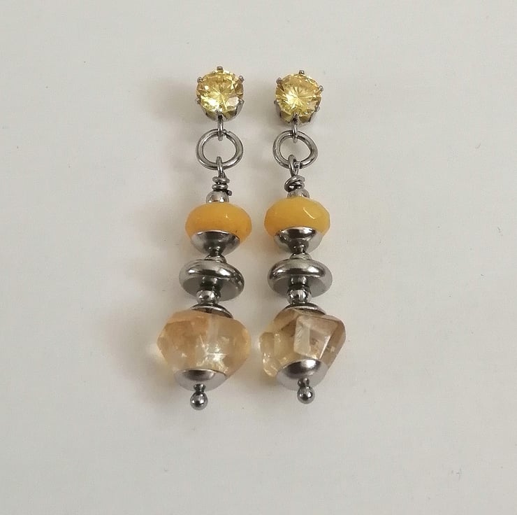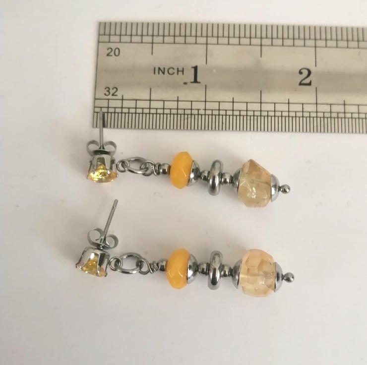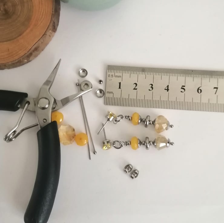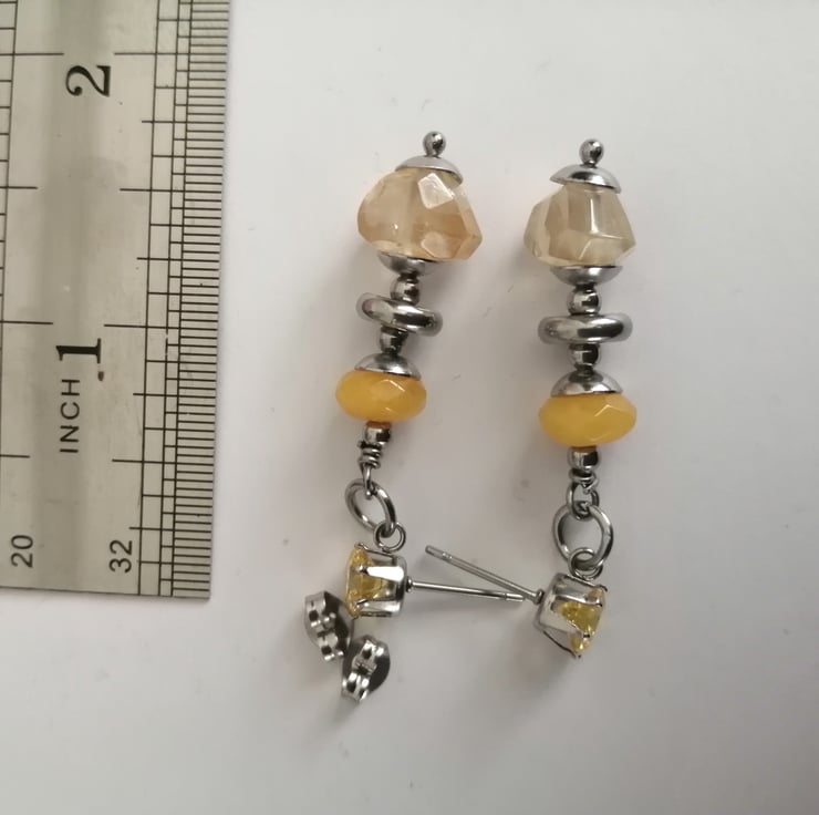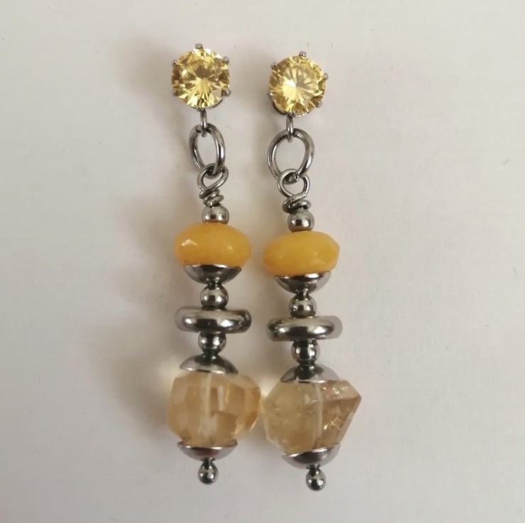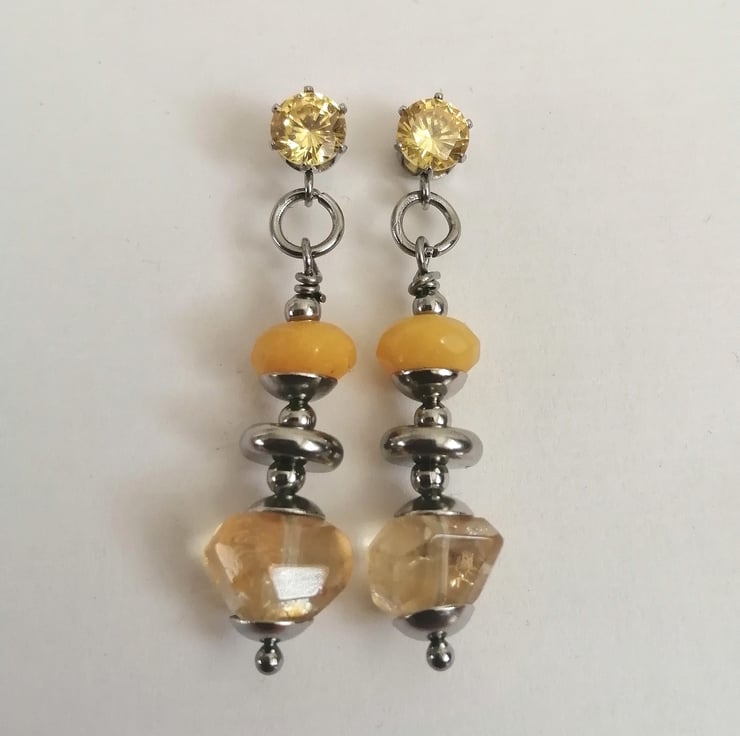For a brilliant shine I set the cubic zirconia 4mm stone, chose the opaque yellow coloured jade and teamed it with a tumble citrine faceted bead. I wanted this design to have different colour depth, shade and size to keep the earrings interesting.