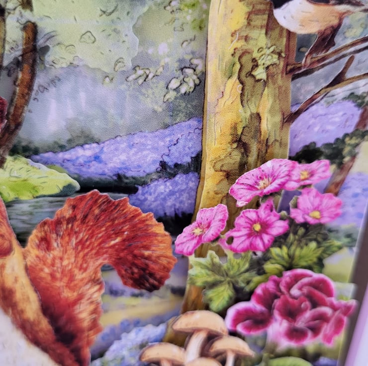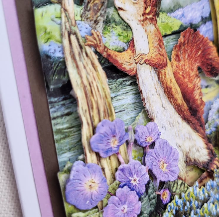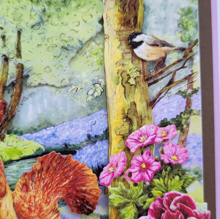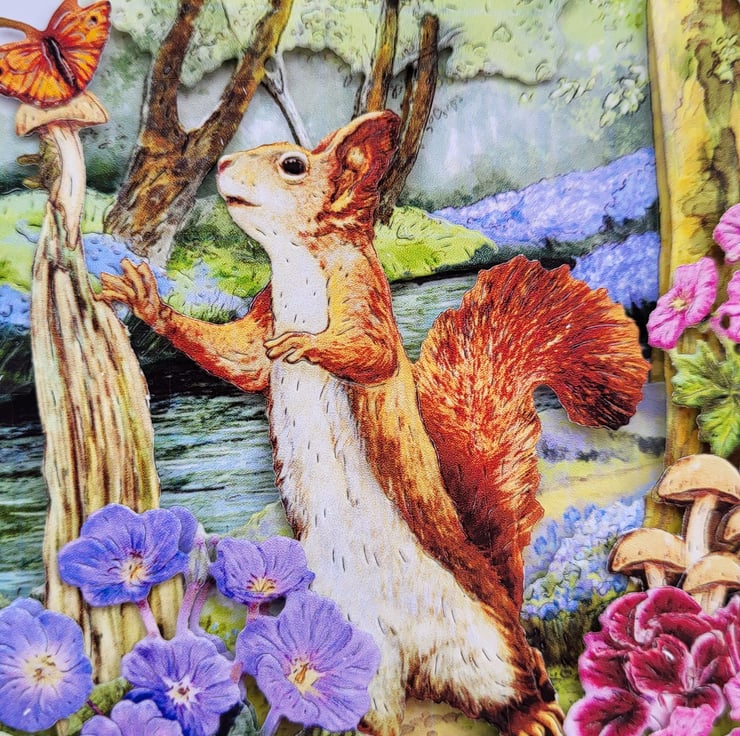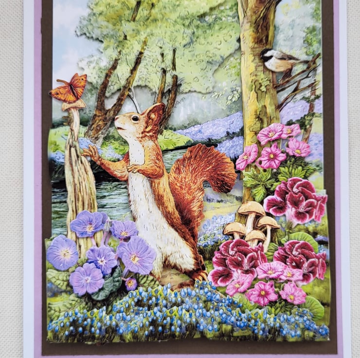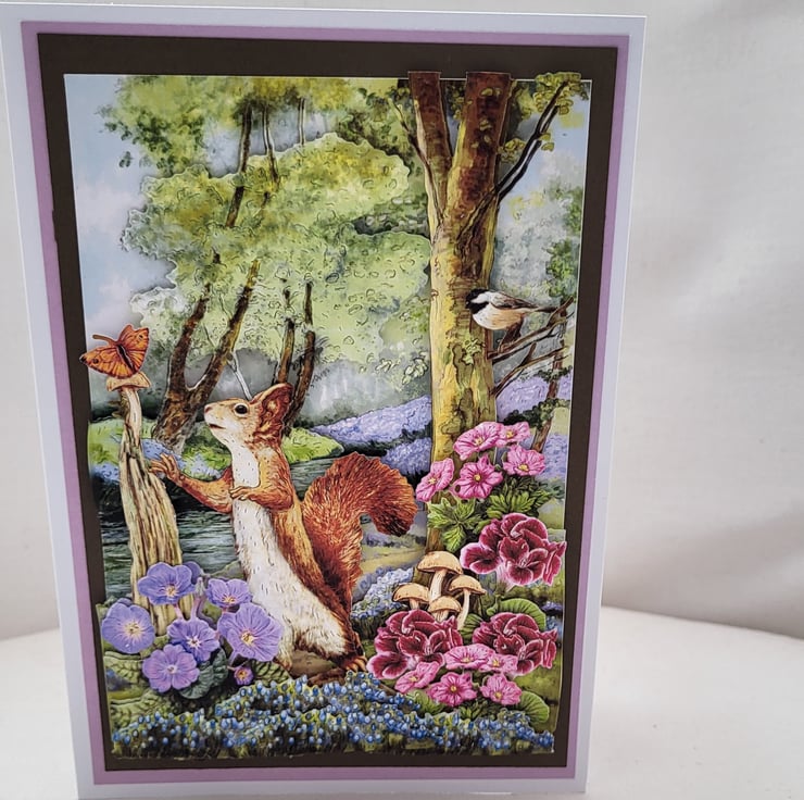 How cute is this squirrel talking to the butterfly? This card is full of flowers and wildlife. I have layered each section up to create a 3d effect.
