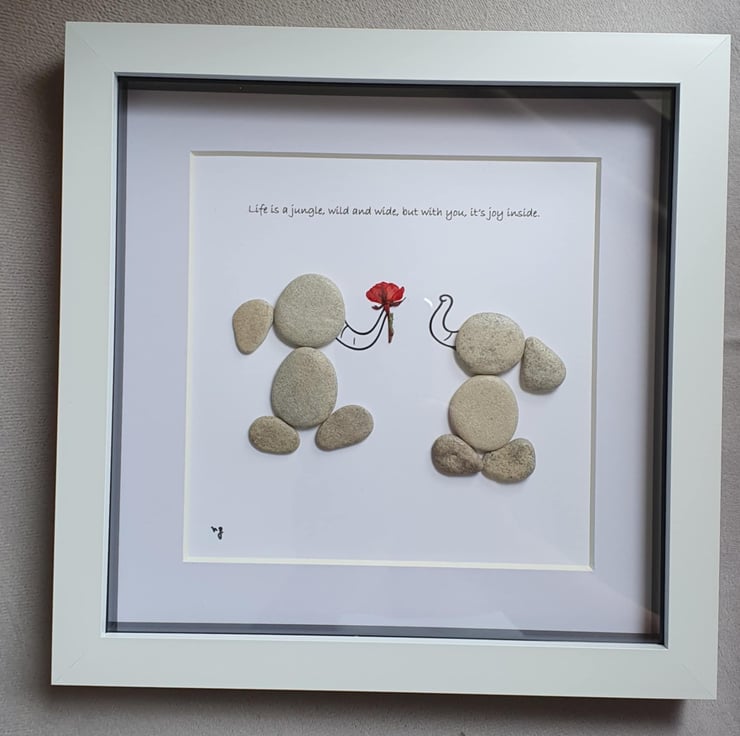 Handcrafted pebble art featuring an elephant couple, thoughtfully arranged with natural stones and adorned with a real dried rose. Framed in white wood, 22.5 / 22.5 cm. Ready to bring warmth and charm to your home or special gifting moment.