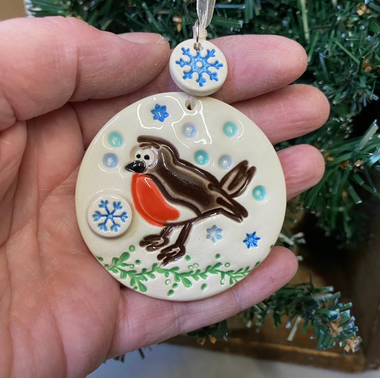 This cute little Christmas robin decoration is made from white earthenware clay. It has been imprinted with a robin motif and carefully glazed with the addition of a raised snowflake and a little snowflake charm. They go through a process of two firings in the electric kiln. This little robin hangs from a cream organza ribbon - ready to hang on your tree. Each decoration measures 5.5cm diameter and is glazed in the front only.