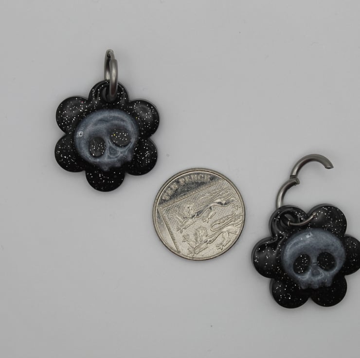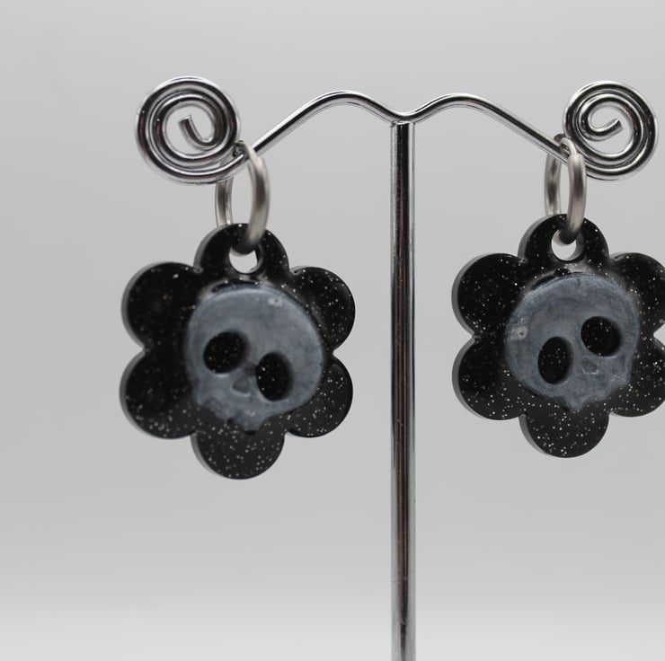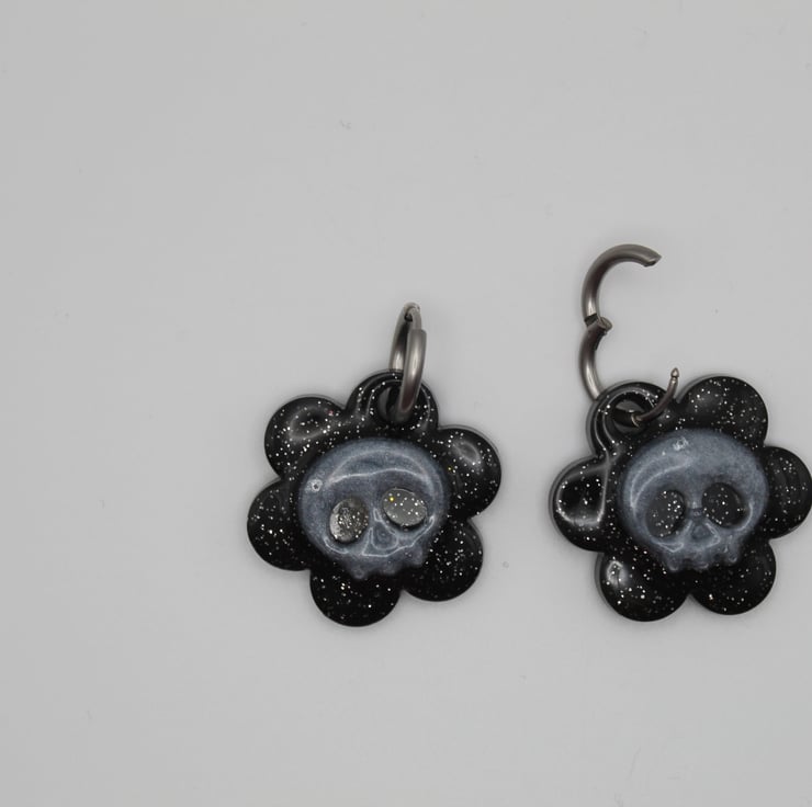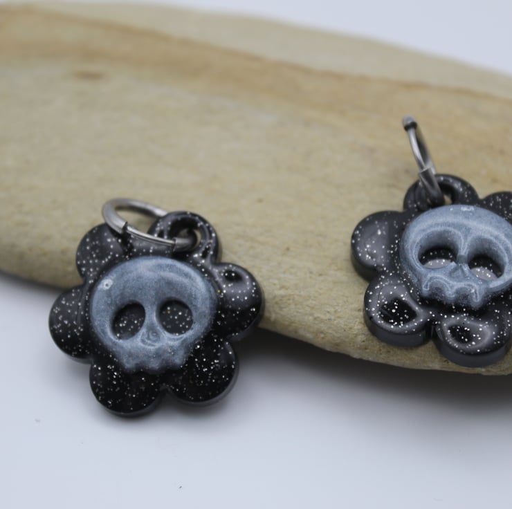 These goth inspired flower skulls earrings have been made with epoxy resin in two different layers and colours. The first layer is a lovely pearl pigment while the second layer is a gorgeous sparkly black.