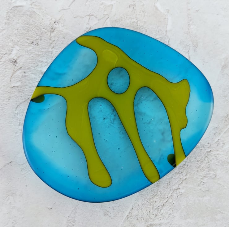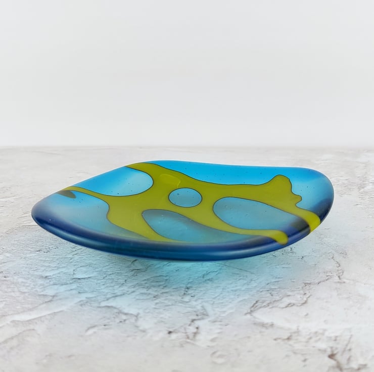 This is a small sized dish from my 'Seaweed' collection of seaglass style kiln-formed glass dishes. The colour is a vivid turquoise blue with a green seaweed motif. The bowl has an organic shape with smooth rounded edges and a rounded base and a satisfyingly weighty feel to it. Larger dishes are also available - see my shop for more.