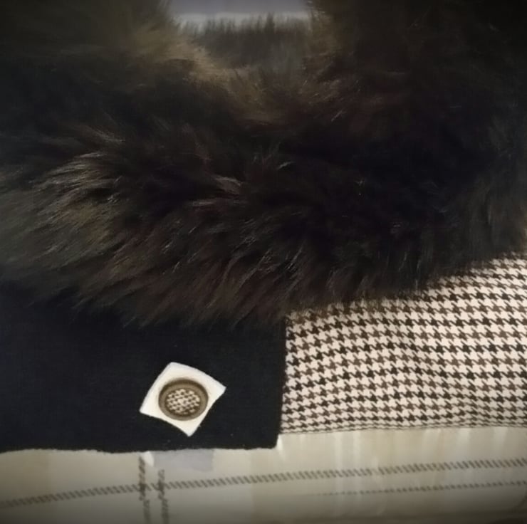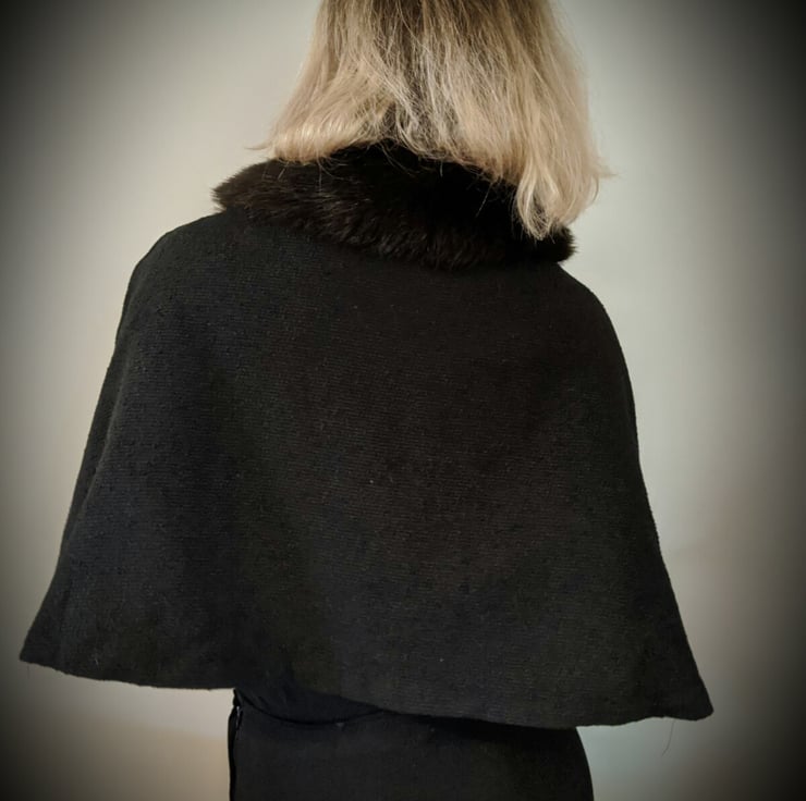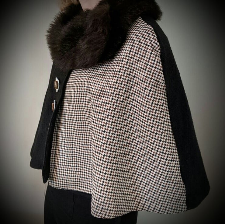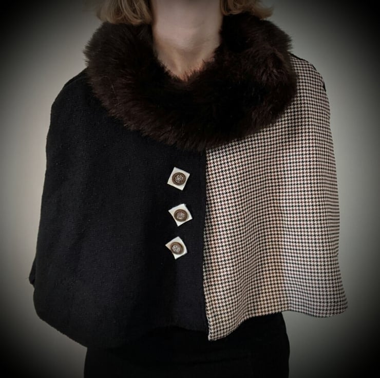 NATASHA . Cute but elegant cape in black and brown dogtooth check front and black boucle back; fully lined in black cotton. This cute capelet has a black, shiny, soft faux fur collar, that clips across your neck thus keeping out chilly winds. Buttons are handcrafted and very individual.