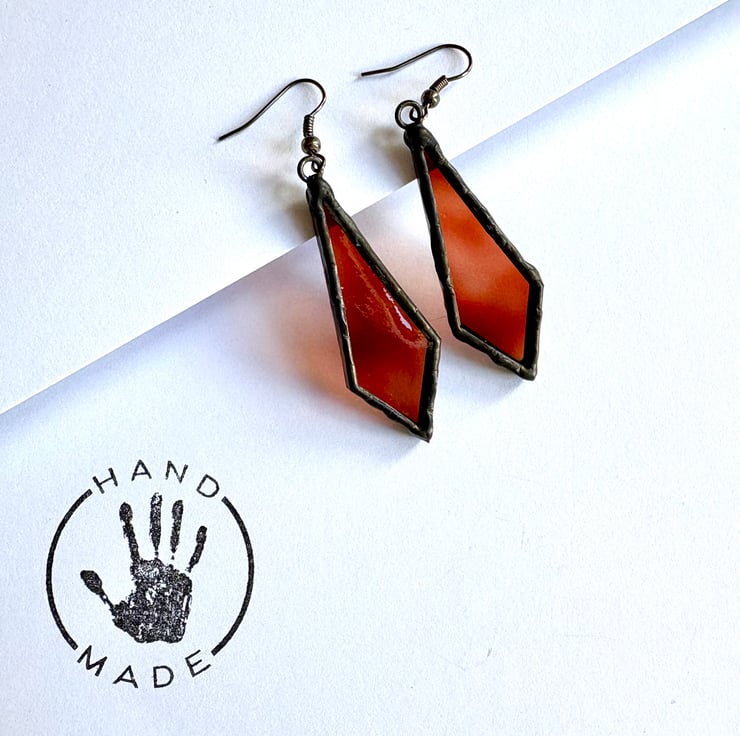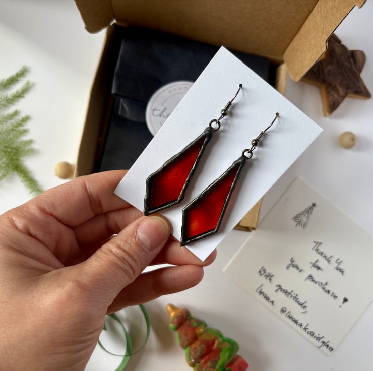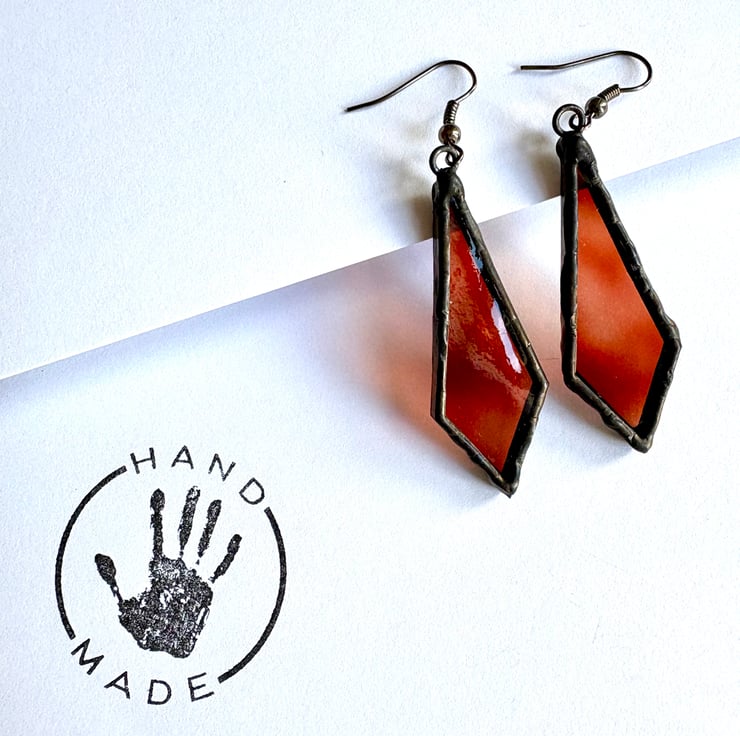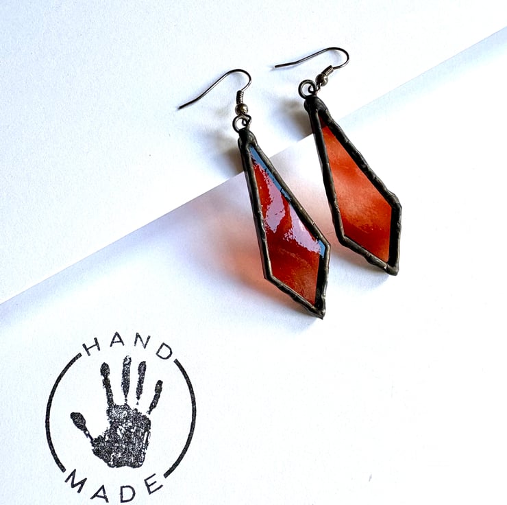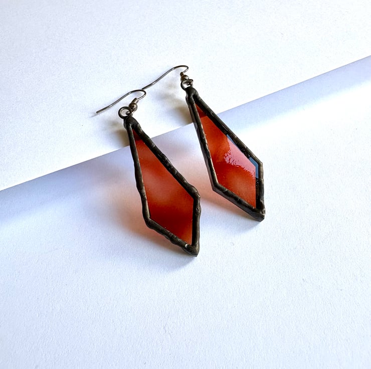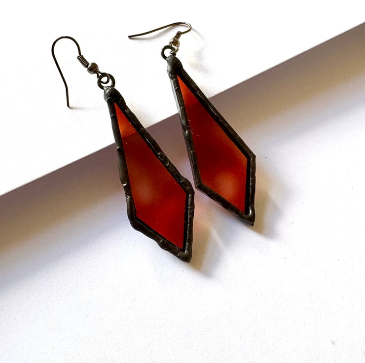 This pair of stained glass dangle earrings has been lovingly made from a gorgeously rich red stained glass. These earrings make a big impact with their colour and are a lovely piece of statement jewellery without much of a weight.