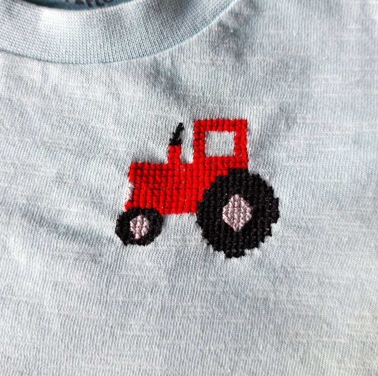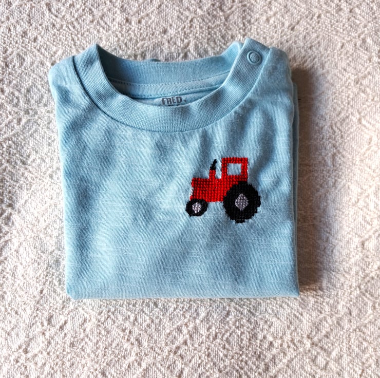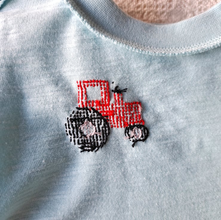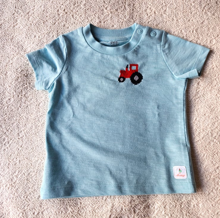 What a lovely gift for a new baby boy! I have hand embroidered a red tractor on the left front of this pale turquoise T-shirt. As I never use a permanent backing fabric when hand embroidering kids' clothing, there is nothing inside to irritate your child's skin. The shirt has short sleeves, a round neck and two poppers on the left shoulder. It is all cotton and can be machine washed.