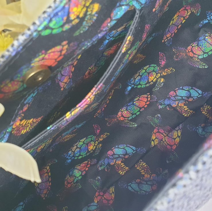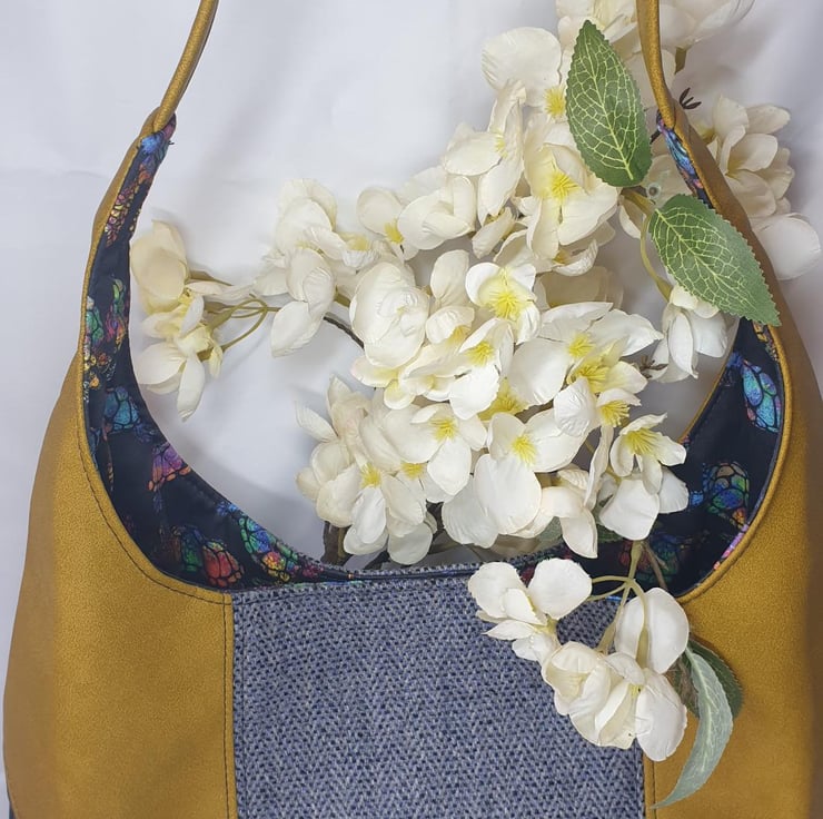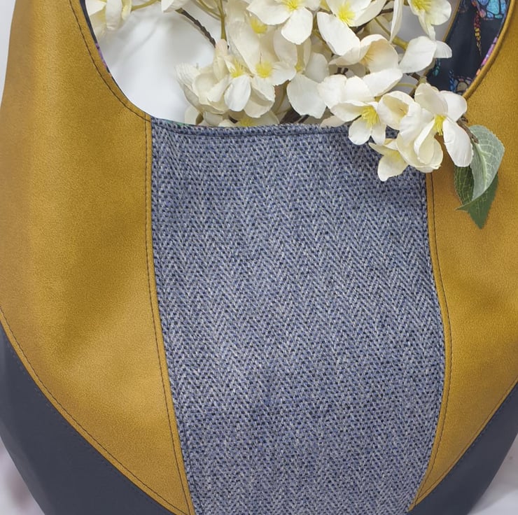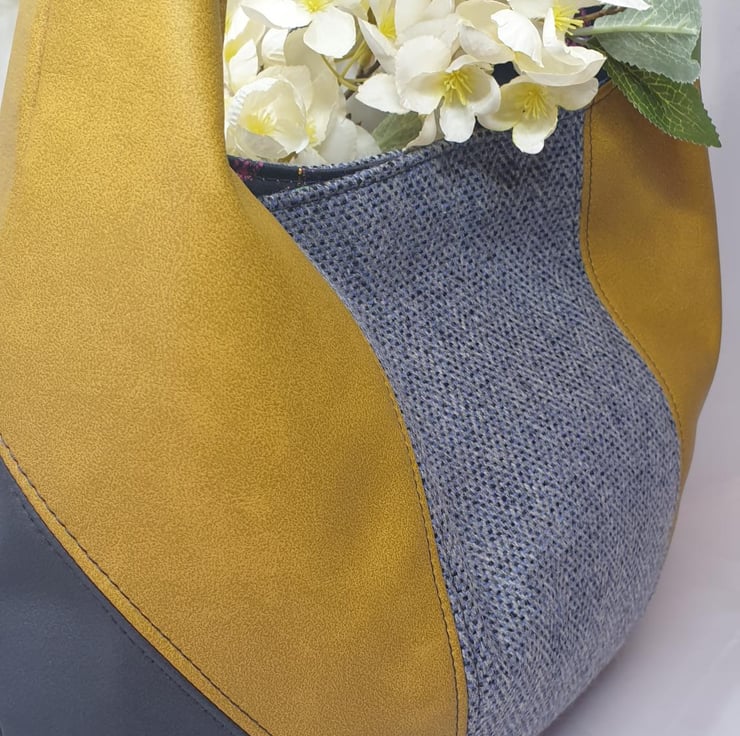 The Estrella bag, in nautical twilight Yorkshire tweed and charcoal grey and ochre Mora luxury faux leather, is a medium sized soft slouchy shoulder / tote bag. The shoulder length grab handle and the roomy interior make this a great bag for shopping or days out. It has a fun turtle cotton lining with a simple slip pocket and the top clips together with a magnetic clasp.