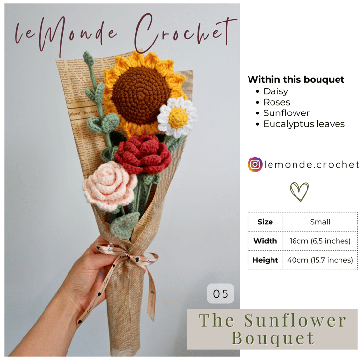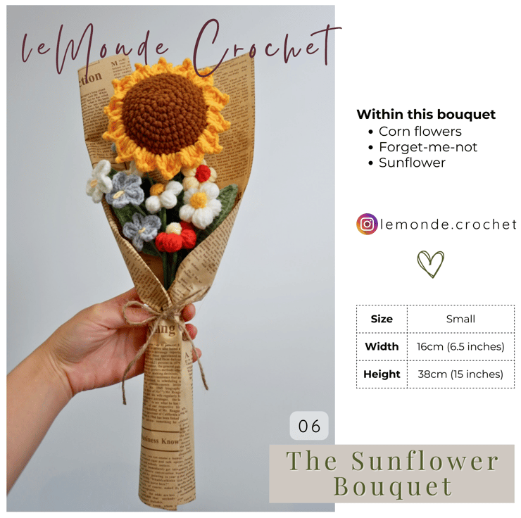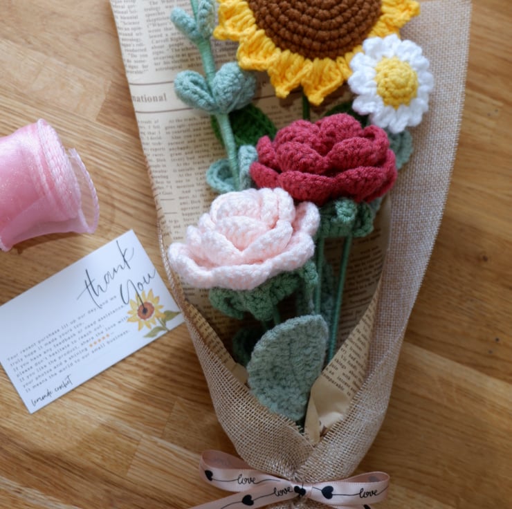 Each item we craft is made with care and attention. We strongly believe in the charm of handmade products, and our crochet flowers are no different. Whether you prefer bright and bold colors or gentle and muted tones, our flowers suit a diversity of tastes and preferences, making them an ideal gift for any aesthetic or occasion (birthday, anniversary, valentine's, mother's day, father's day, graduation, teacher's day, housewarming, celebration).