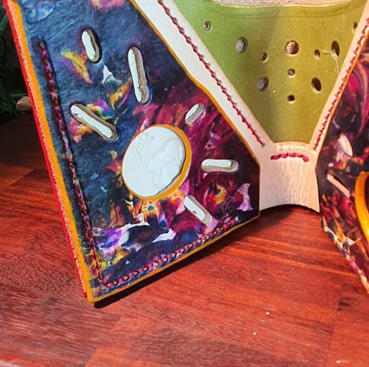 Made from 4mm veg tan leather and heavily marbled dyed in Balcks, Oranges and Reds. This wallet is one of the heavy weights of the wallet series. At a mighty 170g and measuring 4"x4" this wallet has a gorgous feel within the pocket. Stylish, practical and very cool.