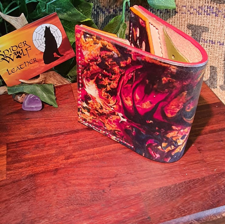 Part of the heavy weight series of wallets. this item is hand made from the finest and thickest wallet leathers available. 4mm Italian veg tan leather has been beautifully marbled dyed using the Suminagashi technique of dying leather, the result is a kalidascope of mixed colour.