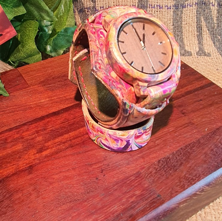 The wooden watch case and leather strap has been marbled dyed using the Suminagashi technique of dying leather.