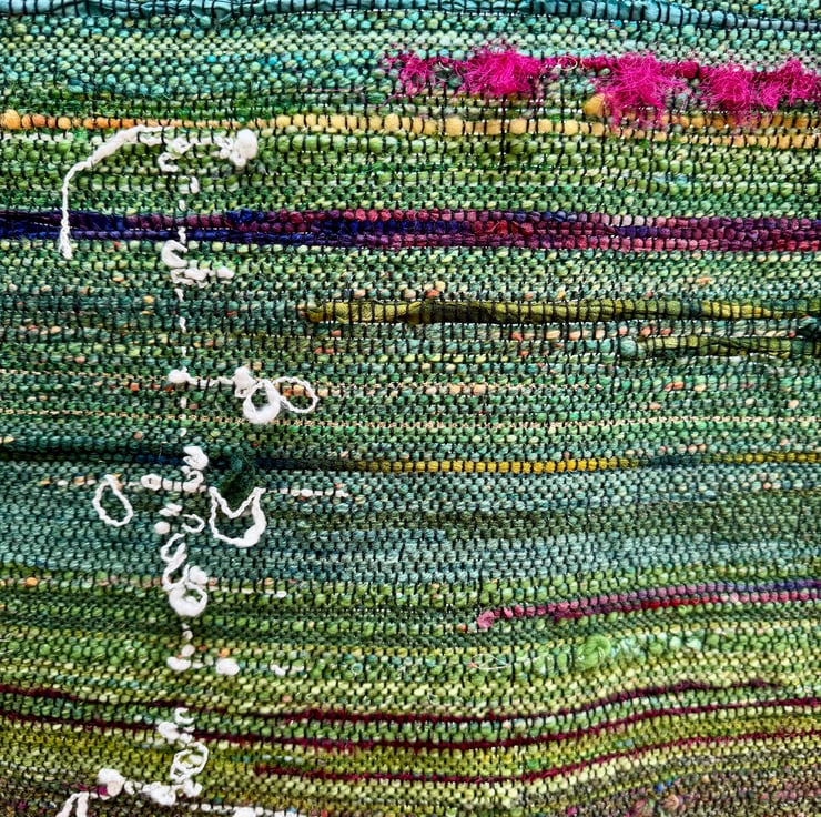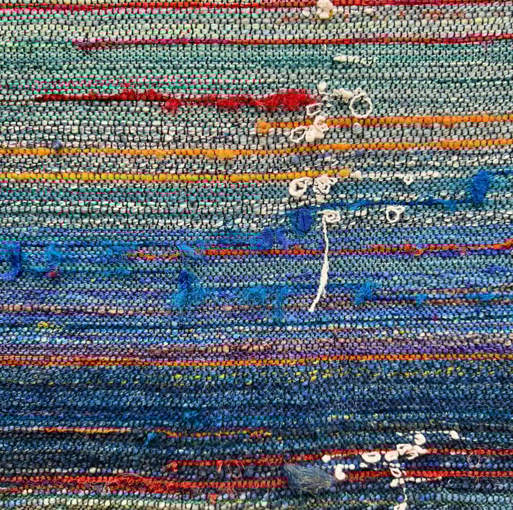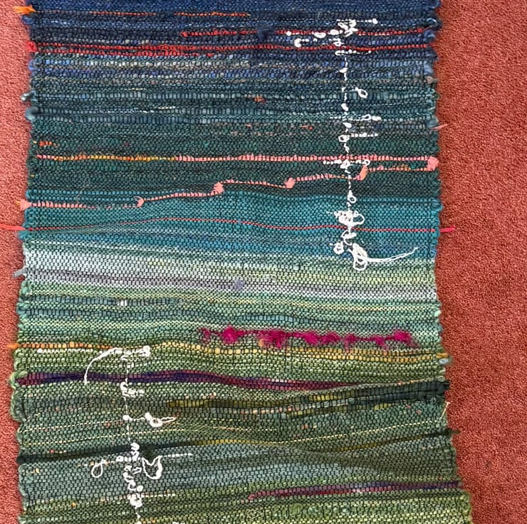 I love saori weaving as a way of exploring how to combine colours and textures in ways not seen in most woven items - it's a very creative process! First I rummage in my wool stash to come up with the sequence of colours I would like to use; often this then requires some spinning extra bespoke yarns to aid the merging from one colour to the next. I'll then look for different textures (eg textured cotton, dyed fleece, sari silk threads and ribbons, glitter yarn) that could either blend in or provide a punch of complementary colour alongside the main colour variation. The end result is never planned out in detail, but all part of an improvisation while weaving at the loom.