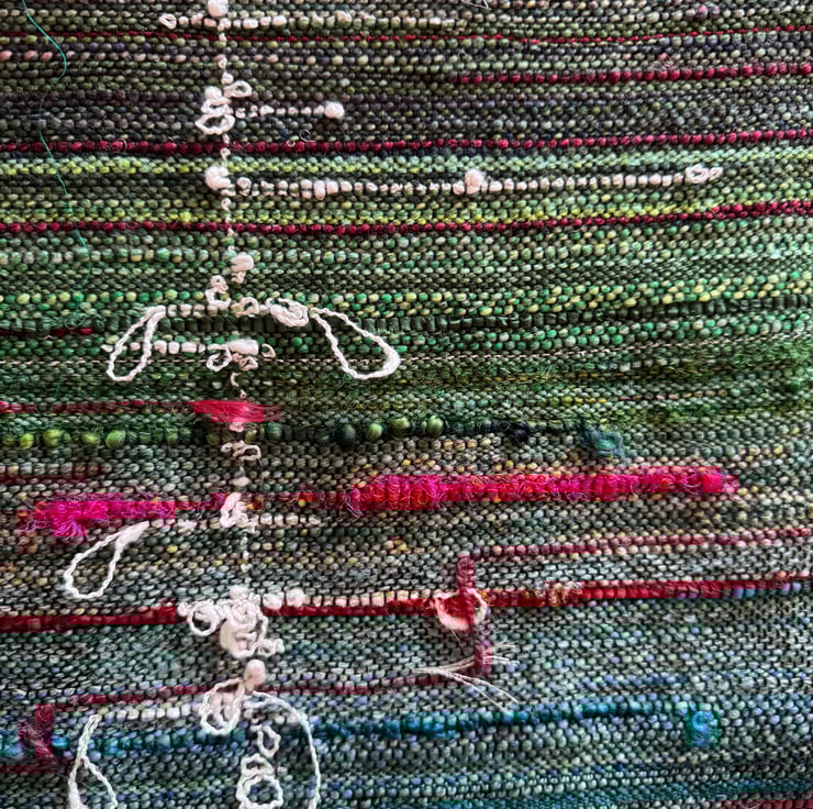 I love saori weaving as a way of exploring how to combine colours and textures in ways not seen in most woven items - it's a very creative process! First I rummage in my wool stash to come up with the sequence of colours I would like to use; often this then requires some spinning extra bespoke yarns to aid the merging from one colour to the next. I'll then look for different textures (eg textured cotton, dyed fleece, sari silk threads and ribbons) that could either blend in or provide a punch of complementary colour alongside the main colour variation. The end result is never planned out in detail, but all part of an improvisation while weaving at the loom.