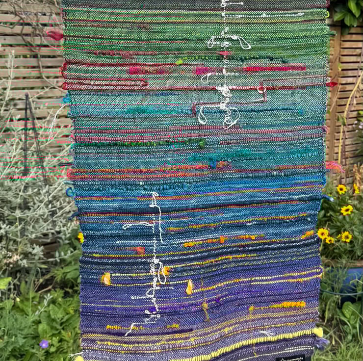 Hand-woven in the very creative method of Japanese 'saori', this decorative wall hanging is unique. A simple black cotton is used as the main warp, and added to this a multicoloured weft that ranges from lime green - through leaf green, teal and blue - to a purple. The colours come mostly from hand-spun wool, but saori silk ribbons, felted wool, sari silk and dyed fleece are also included - either to blend in or to provide a complemetary pop of colour. Added warps in a white slub cotton provide extra interest in short vertical lines of loops and swirls. The hanging is 88 x 47 cm (excluding the fringe) and weighs 240g; a hanging rod is included.