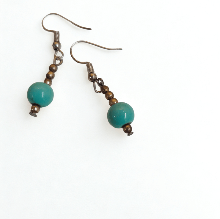 Beautiful ceramic beads in a pale jade colour, combined with small beads in antique gold colour. Hanging on nickel free 925 silver hooks.