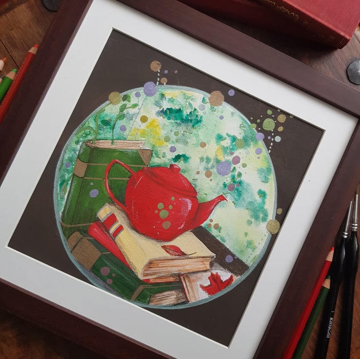 Original art work inspired by a rainy day : through the studio window, the green canopy blurred by the raindrops offered a great contrast to the old books and red teapot that were on my windowsill.