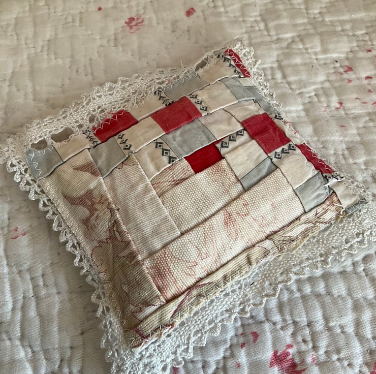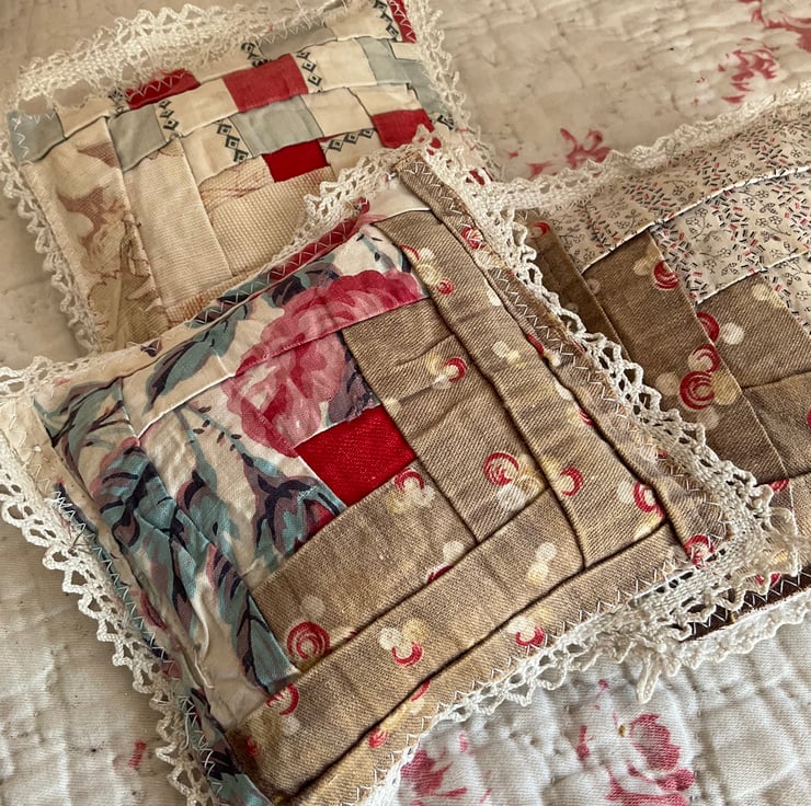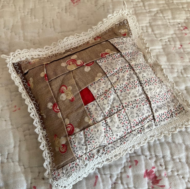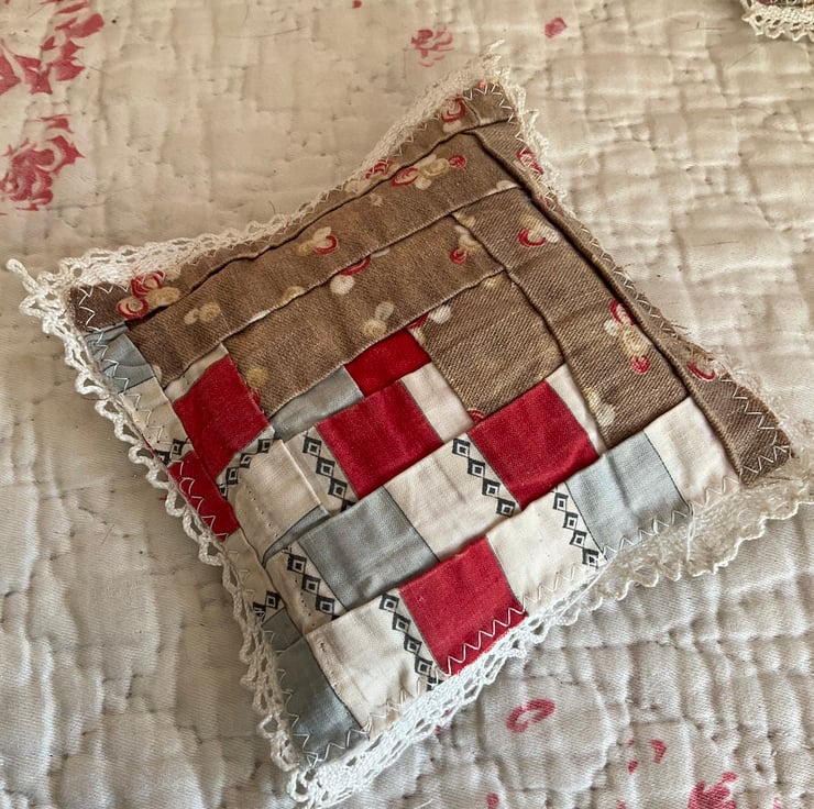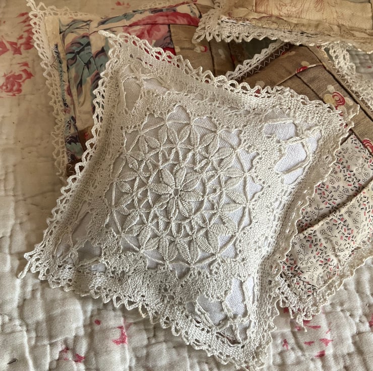 A gorgeous lavender sachet for your bedroom or bathroom. Too lovely to hide in a drawer. One side is an antique log cabin patchwork blocks, backed with antique French linen, and an antique lace doily.