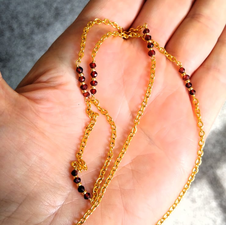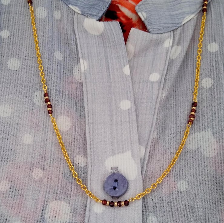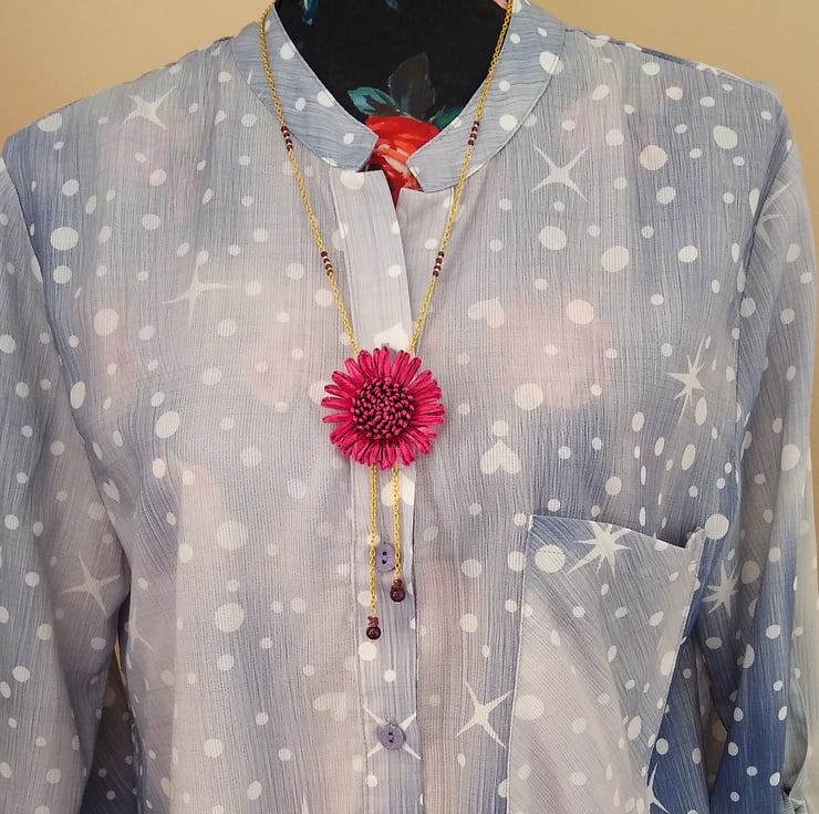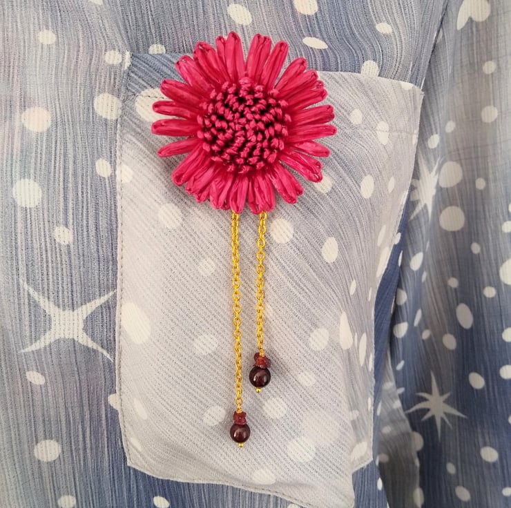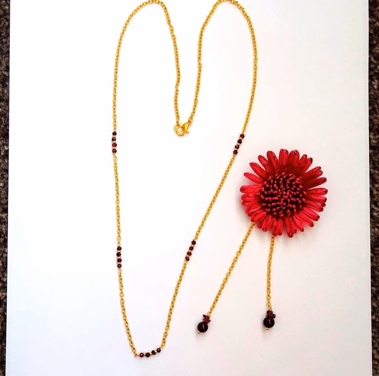 Add a glamourous, bold botanical statement to your wardrobe this season. With this cleverly designed set that can be worn as both a brooch and a pendant, and it comes with a matching 25 inch gold-tone chain accented with sections of 2mm faceted genuine red garnet gemstones. The metal backing on the flower allows it to be styled as a necklace or pinned as a statement brooch. Featuring a large 50 x 50mm dark red/burgundy raffia flower and 70mm gold tone chain tassel, finished with claret wine red 6mm garnet rounds and nuggets gemstones. This stunning combination of crimson and gold match many autumn and winter colours and the poinsettia style flower makes this a sophisticated and elegant set for Christmas parties.