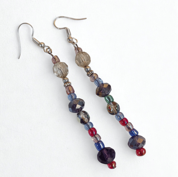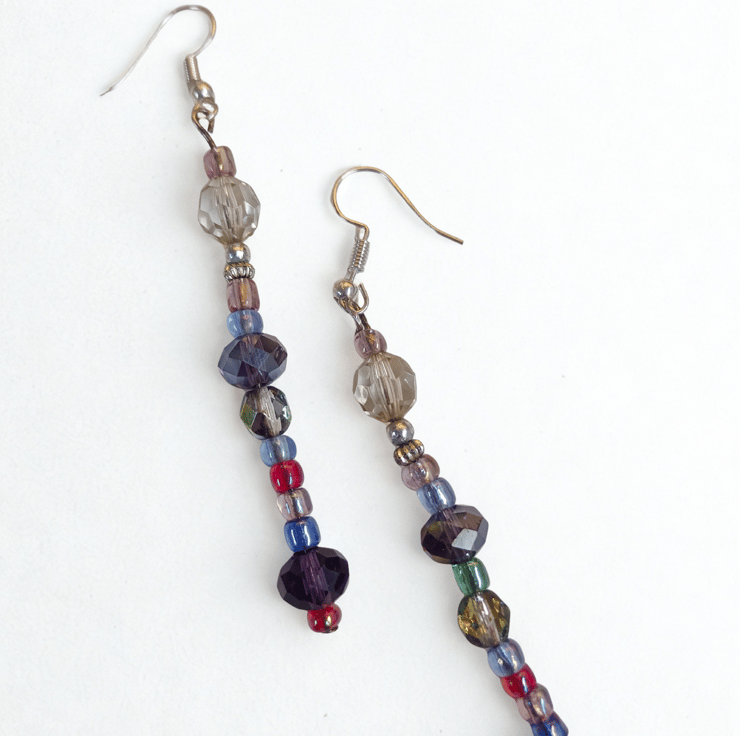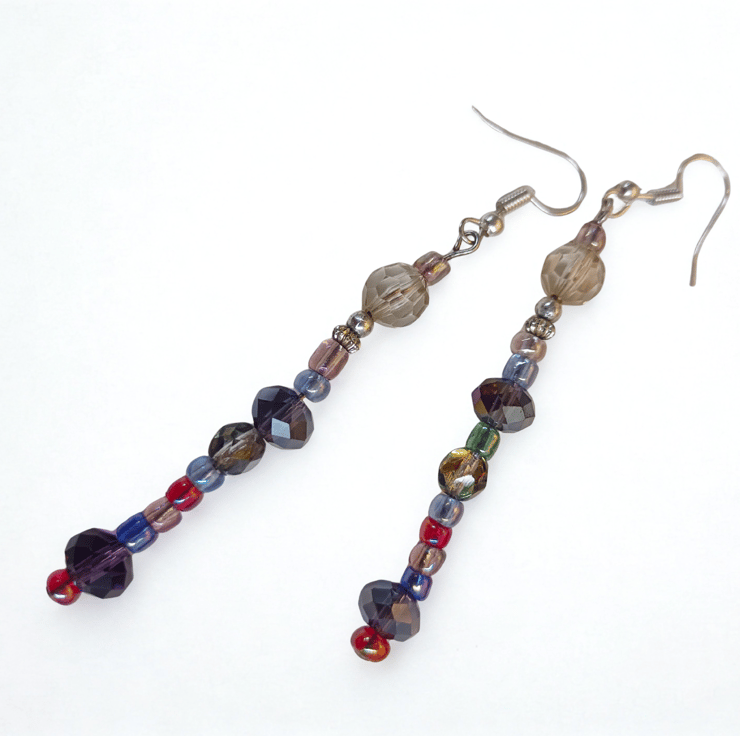 These are simply the best earrings! A long lightweight earring of multicoloured but slightly muted glass and acrylic beads that glint as they catch the light. A combination of teeny, tiny and medium sized beads, some smooth, some shiny, some matt, some round and some faceted. All beads are recycled, reused and reimagined from vintage costume jewellery. Simple and look fabulous on. Hanging on nickel free 925 silver hooks.