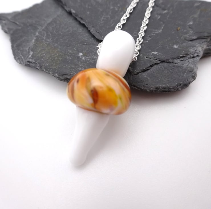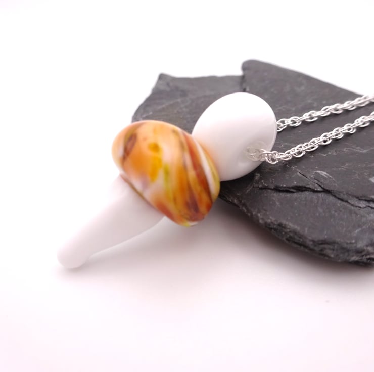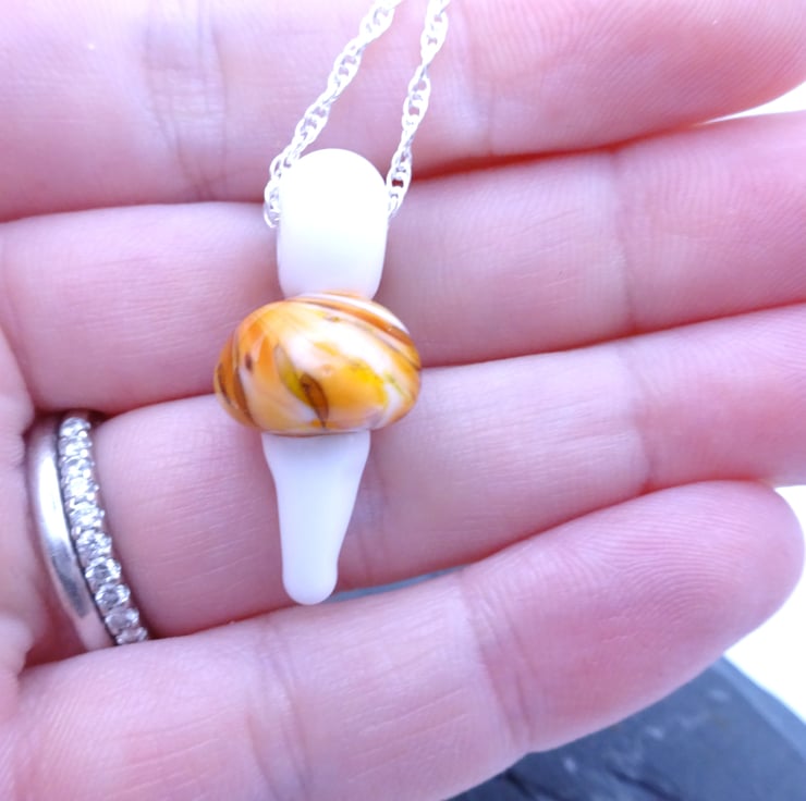 A sterling silver chain strung with a handmade lampwork glass toadstool pendant.
