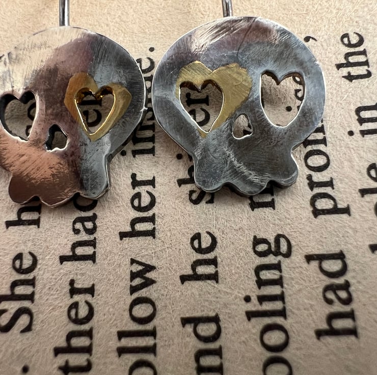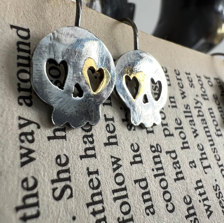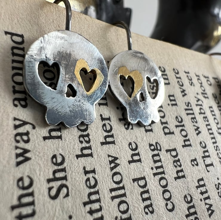 Are you looking for sustainable spooky fun Halloween jewellery? No frightening fast fashion here - just hand-made sterling silver skull earrings, with some added bling with 24ct gold leaf layer added by the process of keum boo. A patina sets off the gold beautifully plus adds a little of that graveyard chic!
