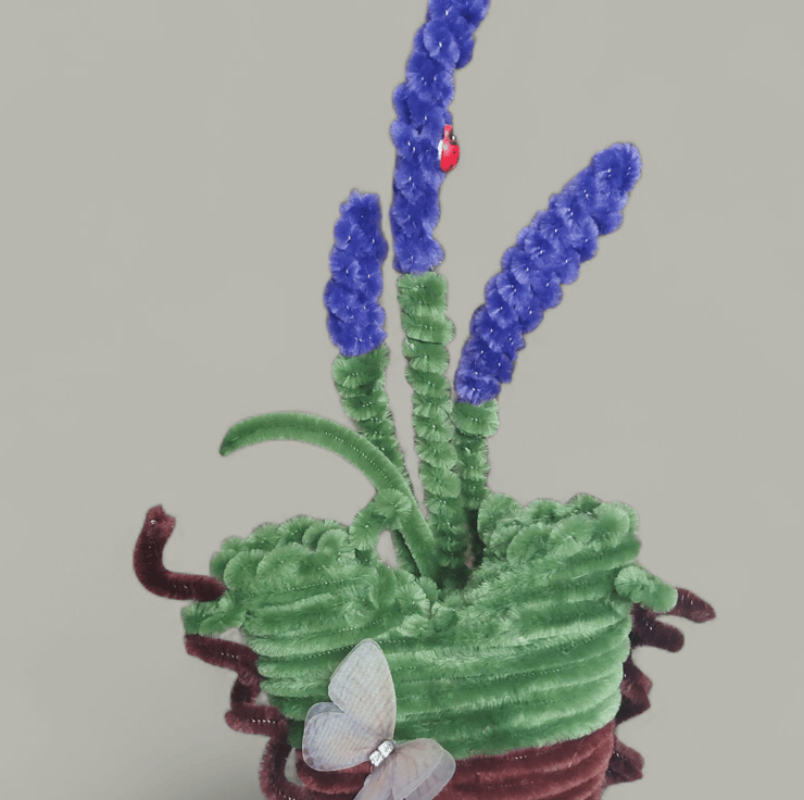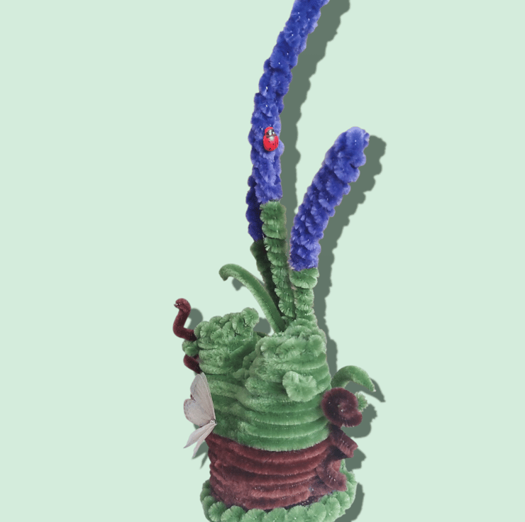 This unique handmade pen or brush holder is designed to look like a little cut tree wrapped in curling vines, with delicate lavender blooming behind it. Carefully crafted from soft fuzzy pipe cleaners, it offers two small spaces to hold your pens, pencils, or brushes while adding a touch of natural charm to your desk.