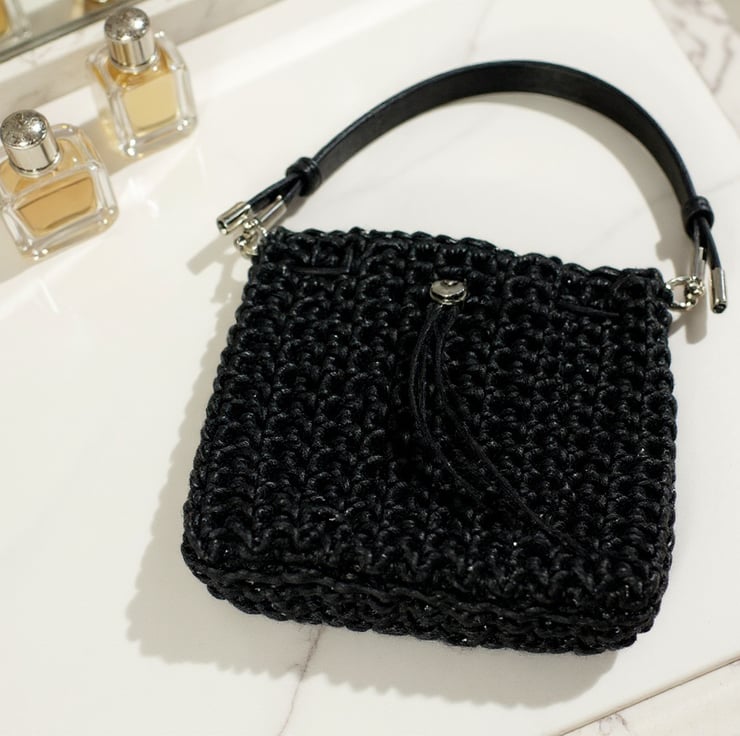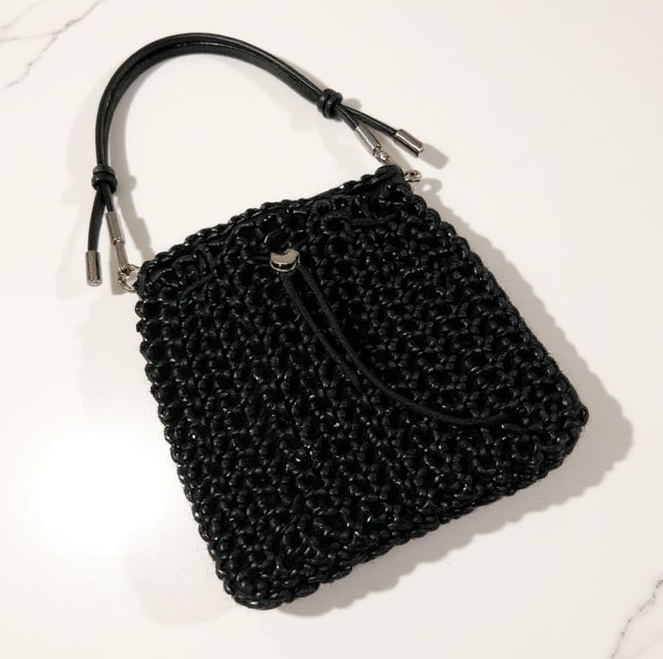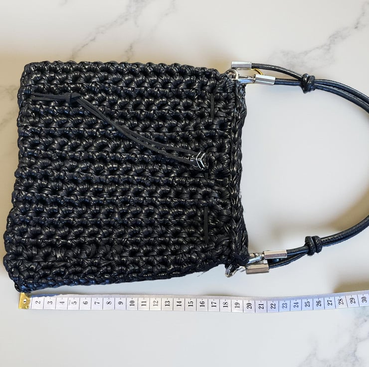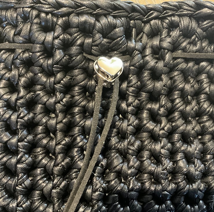 Gorgeous black crochet bag, with adjustable strap to lengthen, cord detail with silver heart clip.