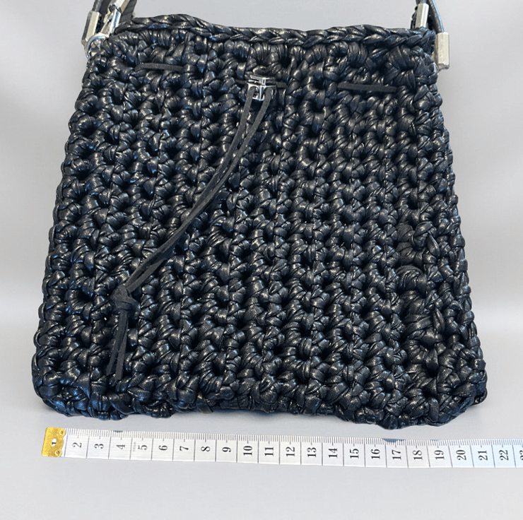 Handcrafted with black Metalic t. Shirt yarn. Soft and lightweight making it perfect for holiday packing.