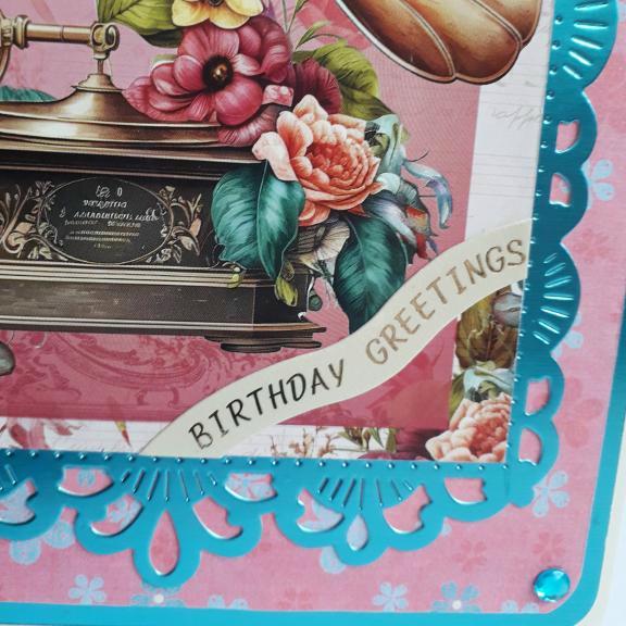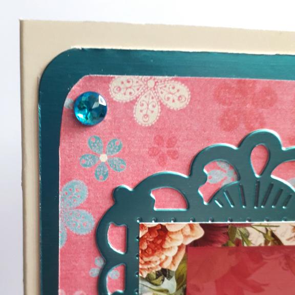 The image is in a fancy die cut frame of teal green mirror card on a background of pink floral patterned paper, more teal mirror card then an ivory coloured base card, the inside of the card has more of the pink patterned paper with a matching blank die cut for you to write your message. There is a blue gem in each corner and an ivory coloured "Birthday Greetings" banner across the bottom right hand corner of the image.
