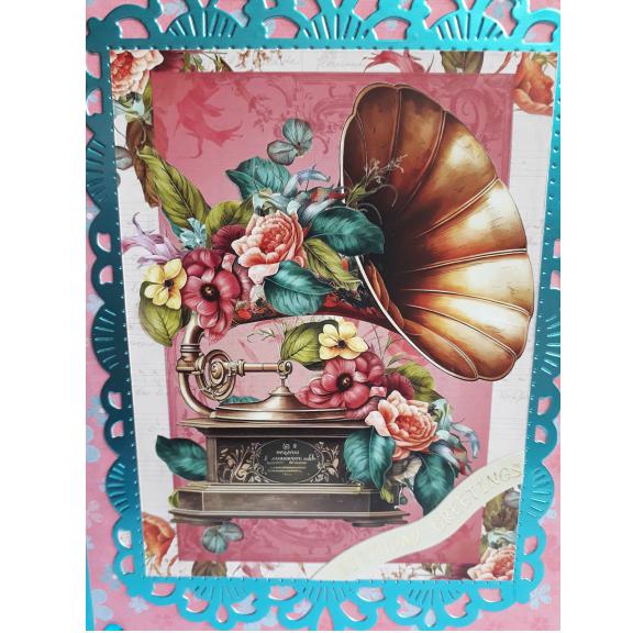 This birthday card features a gramaphone adorned with flowers in shades of pink, peach and lemon with teal and green leaves.