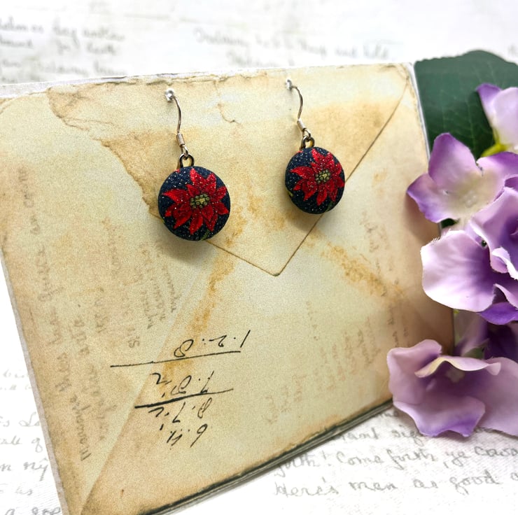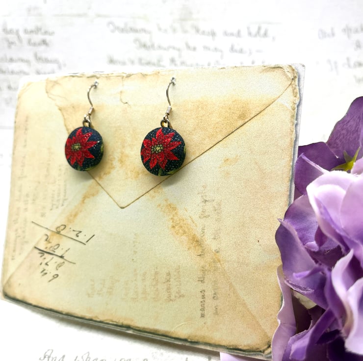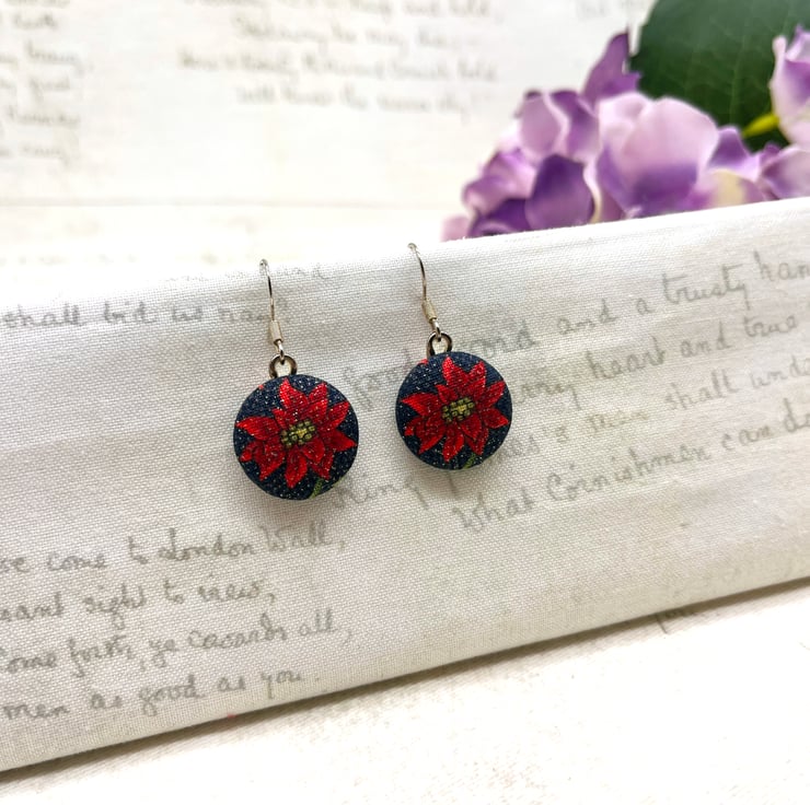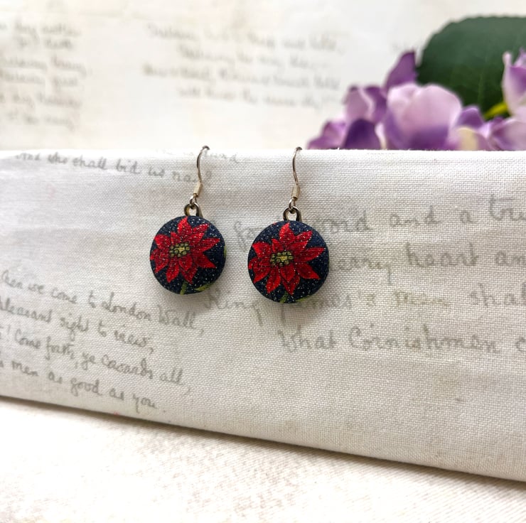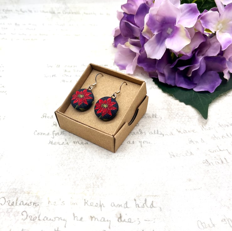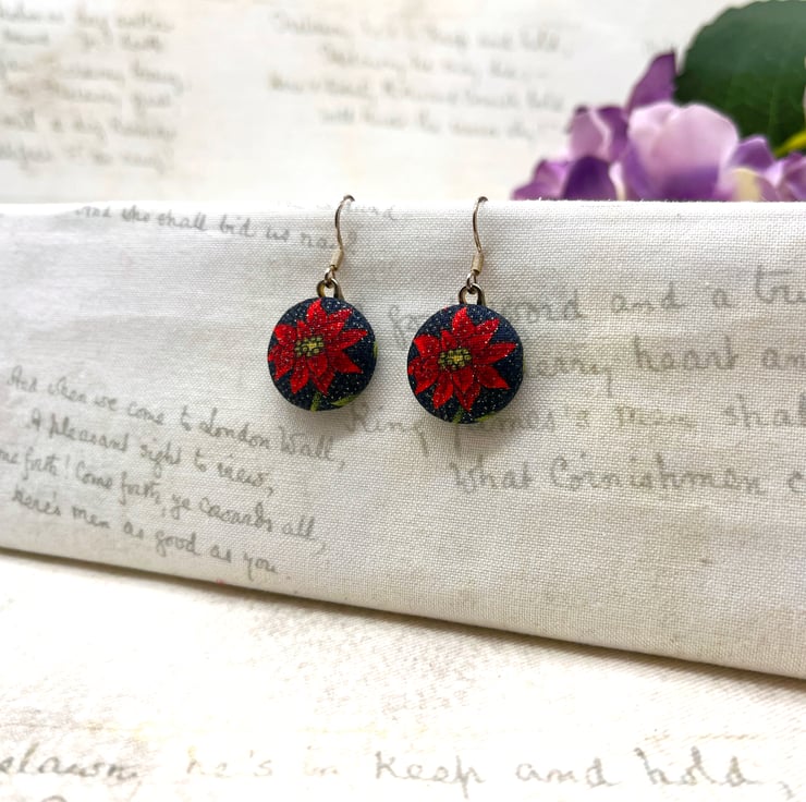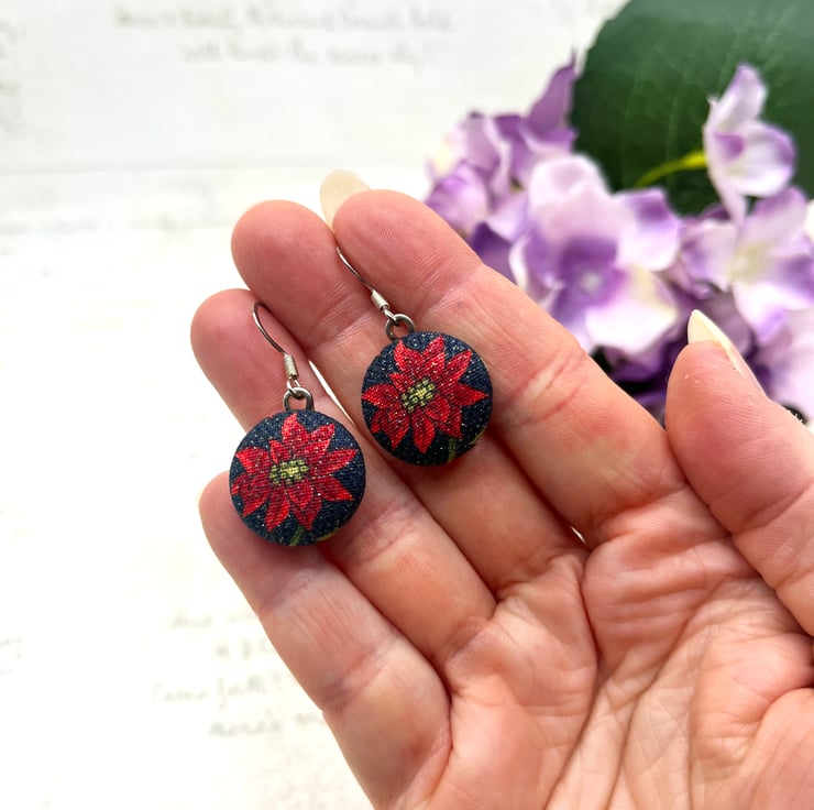 I've captured the magical beauty of Christmas poinsettias in these stunning fabric dangle earrings! Picture yourself at holiday gatherings - these gorgeous red flowers on deep navy sparkle beautifully as you move, making you feel effortlessly festive and elegant.
