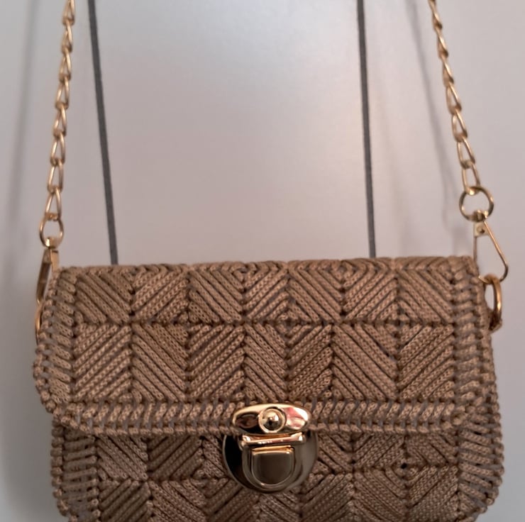A small gold coloured handmade crocheted handbag with gold chain strap, metallic fastening and gold satin lining.